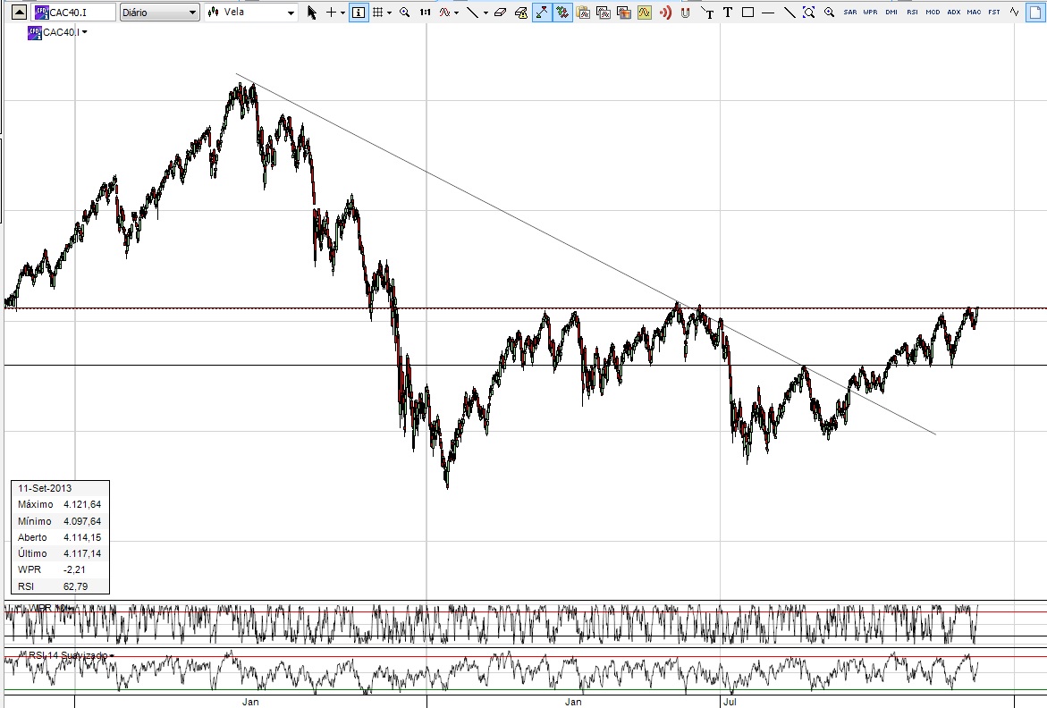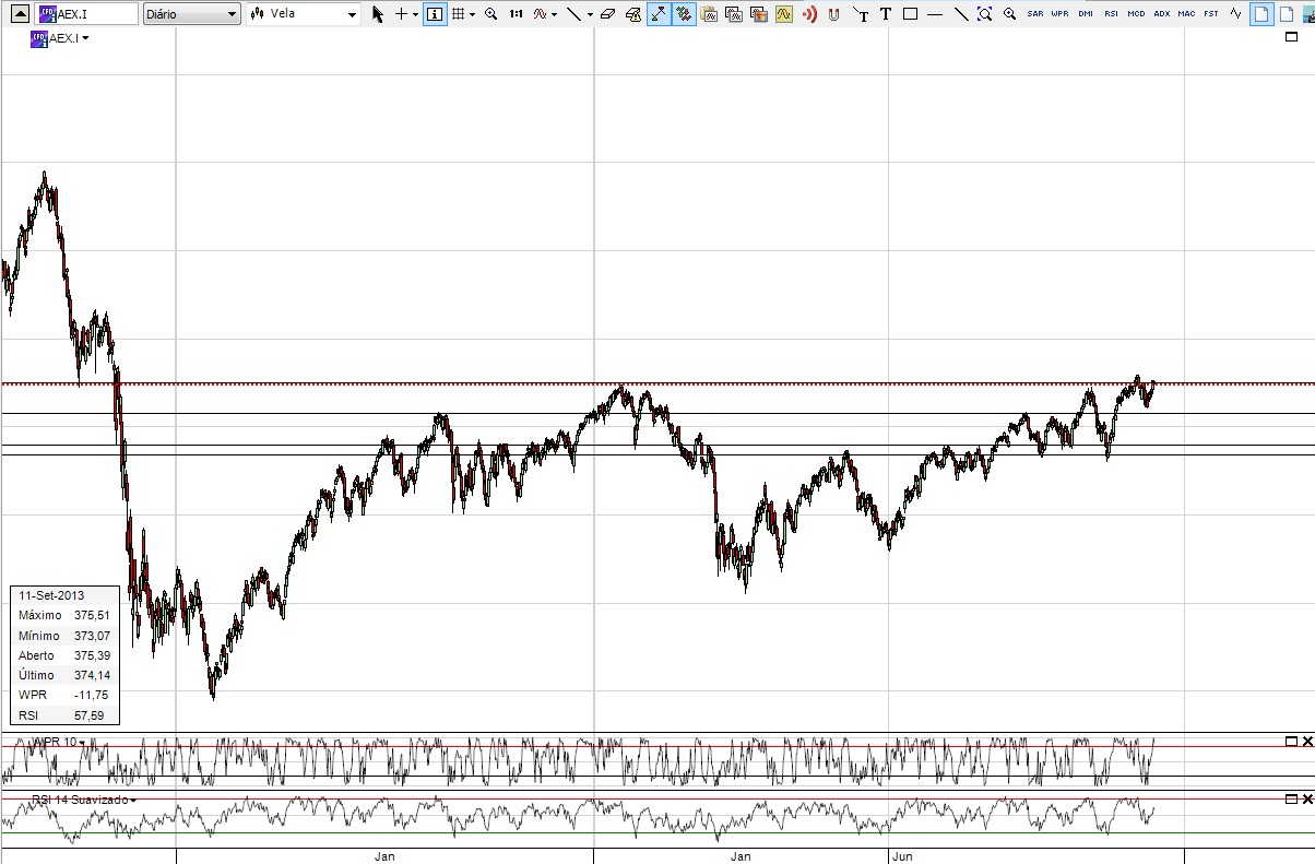 Existe neste momento três índices todos eles da Euronext com comportamentos iguais e todos eles a bater na resistência mais alta. Como muito se tem falado aqui de Bull market, nunca esquecer que estes sempre que atingiram estes valores tiveram um recuo. Para quem esta dentro é manter-se, mas para quem esta interessado em entrar e, como tenho lido aqui, talvez seja melhor esperar pela "ruptura" das resistências.