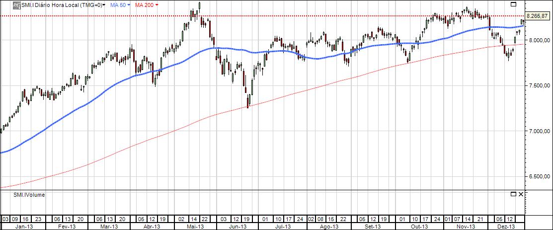 Suiça - Abriu a 6975,20 e terminou nos 8202,98 pontos. Subiu 17,60%