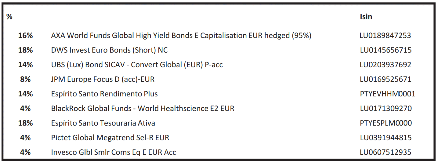 Capital de 20 mil euros; prazo » 5 anos; baixo/médio risco, objectivo rentabilidade média de 5 a 8% ano, em euros / sem risco cambial, pouca volatibilidade, aceitável até - 05%/-10%, diversificado, entre 4 e 8 fundos e com track » 5 anos. Trabalho com Big / BCP.