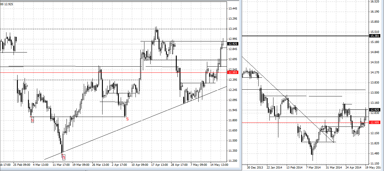 O H&S traçado não é muito ortodoxo uma vez que o ombro direito está praticamente ao mesmo nível da cabeça, no entanto a LTA secundária foi quebrada e o suporte dos 12,40 está por um fio. Se quebrar com volume parece ser uma boa oportunidade para uma entrada curta. O que vos parece?