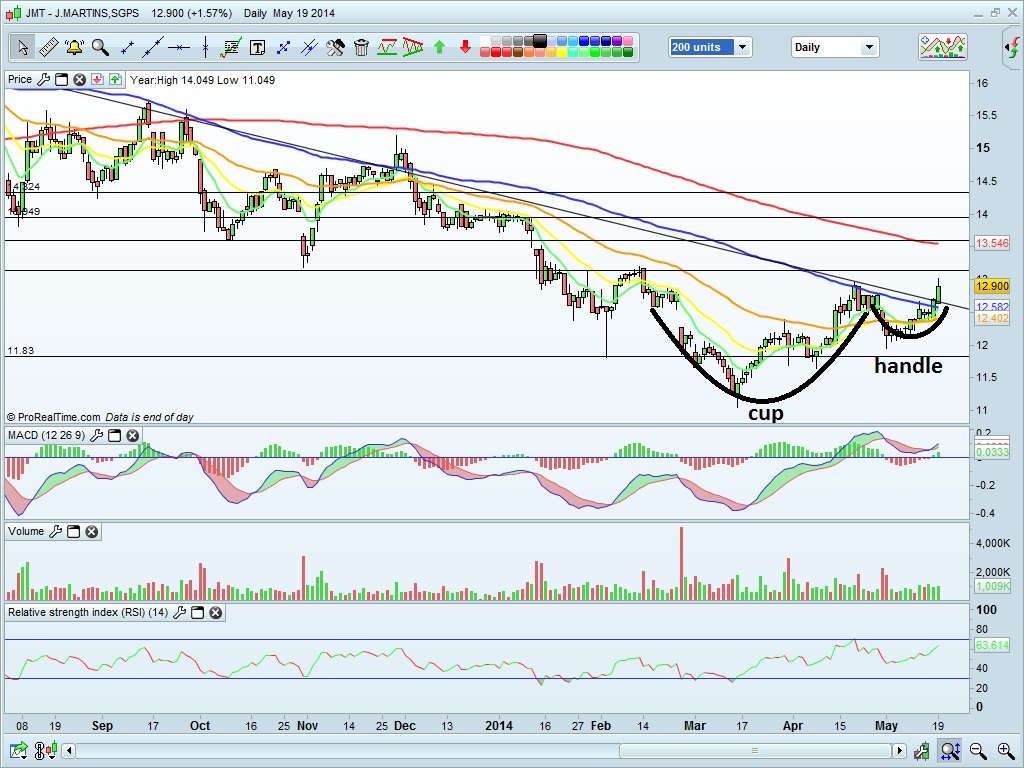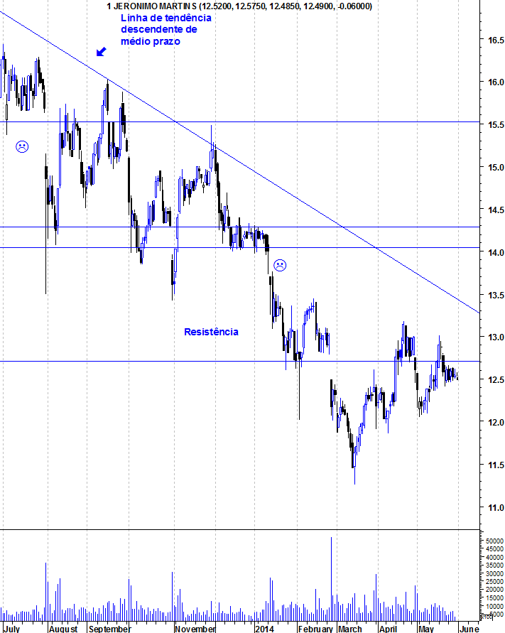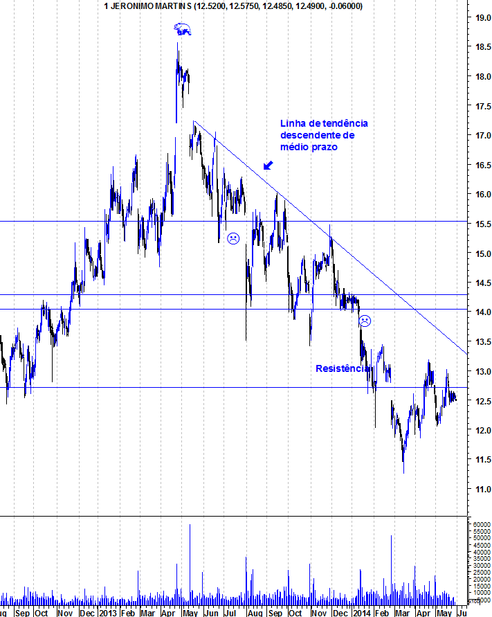 Muito obrigado pelos gráficos publicados. Neles é visível a tendência da Jerónimo Martins, no entanto, estando a bolsa nacional a viver um período de Bull Market (de acordo com um artigo seu), e, tendo a JM adquirido recentemente autorização para comprar mais lojas na Polónia, acha que prevê-se, nos próximos dias, uma quebra da resistência dos 12,40€/12,50€? E a curto/médio prazo, a linha de tendência continuará descendente, ou haverá uma inversão de Bear para Bull?