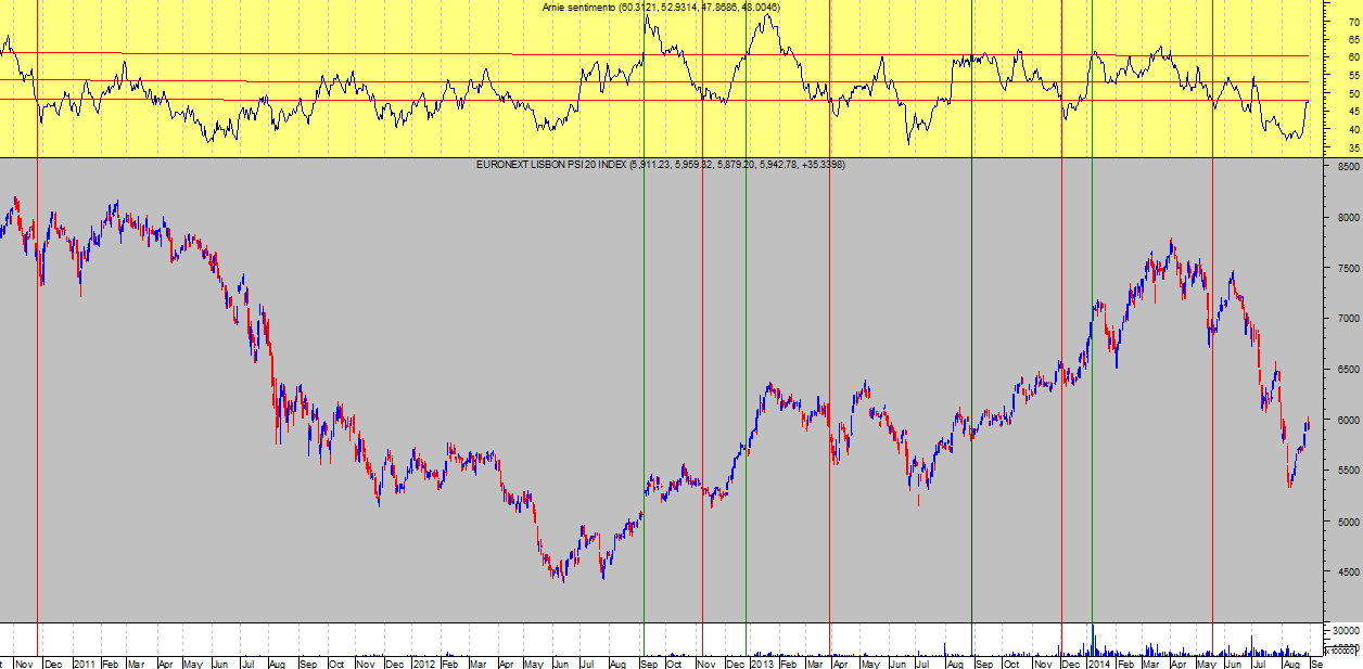 As regras são muito simples: há 3 linhas de referência de sentimento. Acima da mais alta o sentimento do mercado é muito positivo, abaixo da mais baixa o sentimento é muito negativo e a linha do meio será a do equilíbrio geral mas para efeitos de position trading já não terá grande importância uma vez que representa um balanço emocional neutral à escala temporal utilizada. Embora eu reconheça que a linha intermédia possa ser muito interessante para efeitos de swing trading, quando utilizada em posições contrárias para períodos mais curtos, era sessa a intenção do Arnie, embora não conheça as regras de entrada e saída que ele usava na altura com esse período, e daí que era ótimo que ele pudesse confirmar se é que ainda se lembra desses bons velhos tempos de pesquisa de bons indicadores.