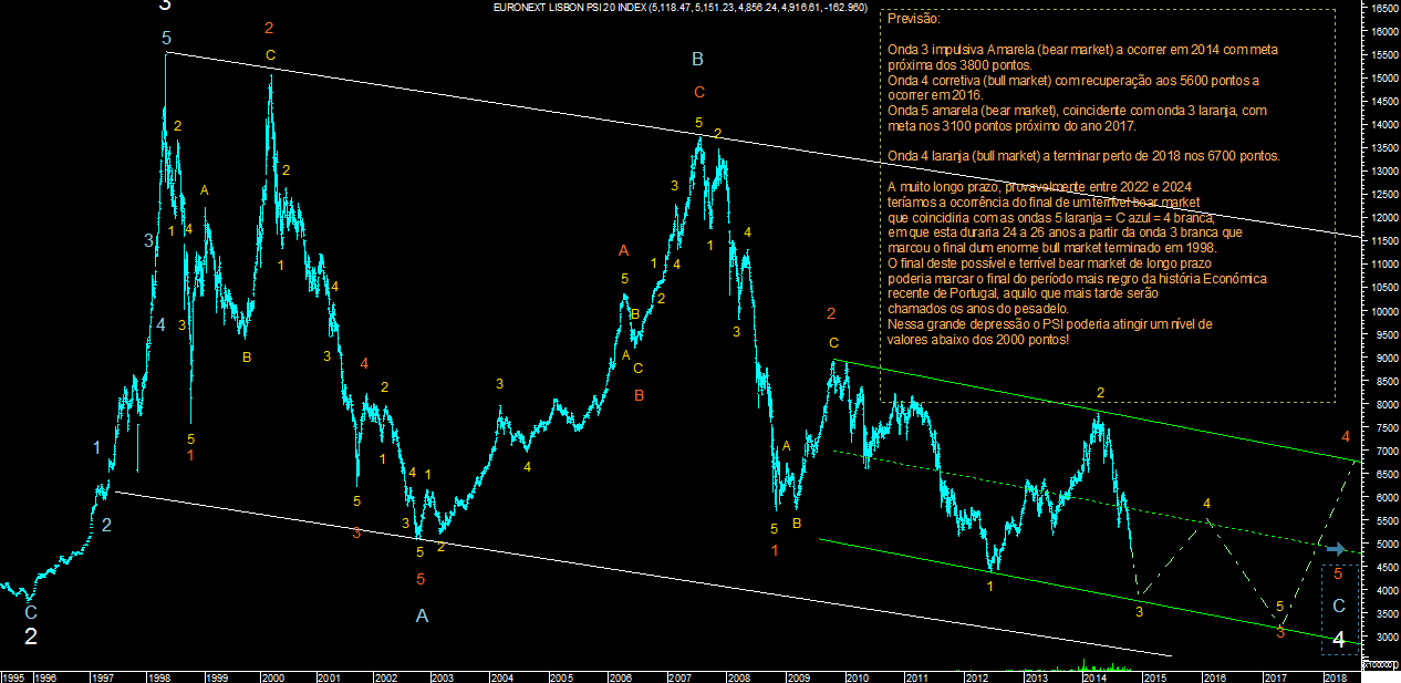 Baseado num estudo das ondas sequenciais de Elliott, em escalas integradas de grandeza diferenciadas, deixo-vos ficar um cenário possível de possível evolução do nosso índice PSI, que bem poderia ser apelidado como o período do grande pesadelo da Economia em Portugal!