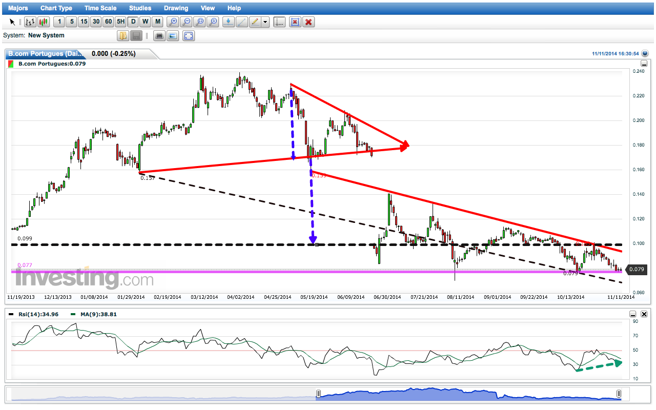 A ver vamos, a minha opinião expressei já à alguns dias atras, que ela iria visitar o intervalo entre os 0.075 e os 0.08, uma vez que se trata de um suporte forte e que na minha opinião, depois de a aguentar, devá encetar um processo de subida pelo menos no curto e talvez medio prazo. No caso de não conseguir segurar, que tenho dificuldade em acreditar, penso que irá visitar o preço do AC ou lá muito proximo.