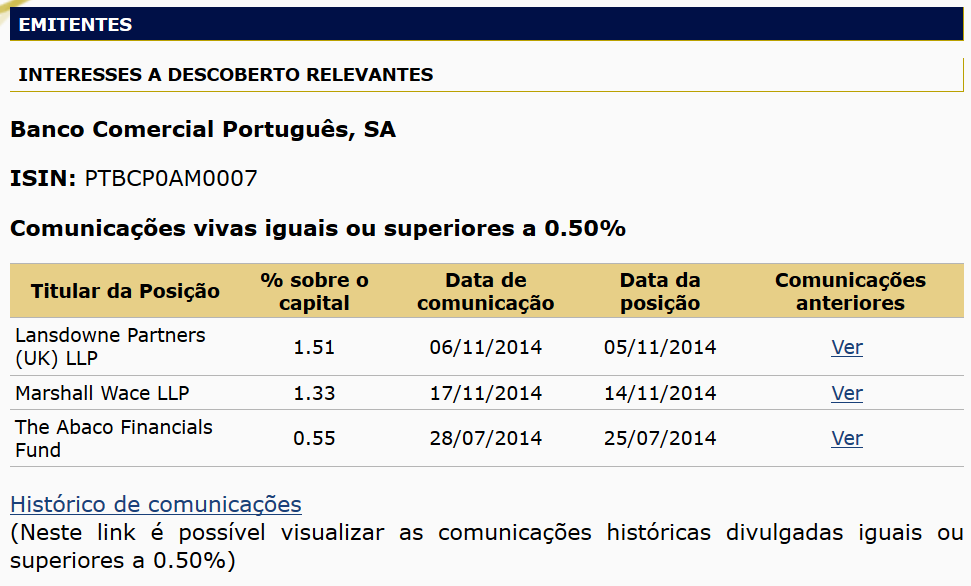 no BCP vai existir sempre posições curtas devido ásua liquidez pelo gráfico que ai se encontra o pico maior foi em junho coincidente com a grnade subida do bcp ate os 0.1410 se não estou em erro no dia que a black rock reforçou em força e vai continuar a existir short no bcp ..... mas o titulo desce e sobe .... não sera isso que vai afastar a maior parte porque entre uma luta de fundos a descoberto e fundos para ganhar com as subidas alguem vai perder .... resta os pequenos aproveitar a onda e acertar nas entradas e momentos certos....
