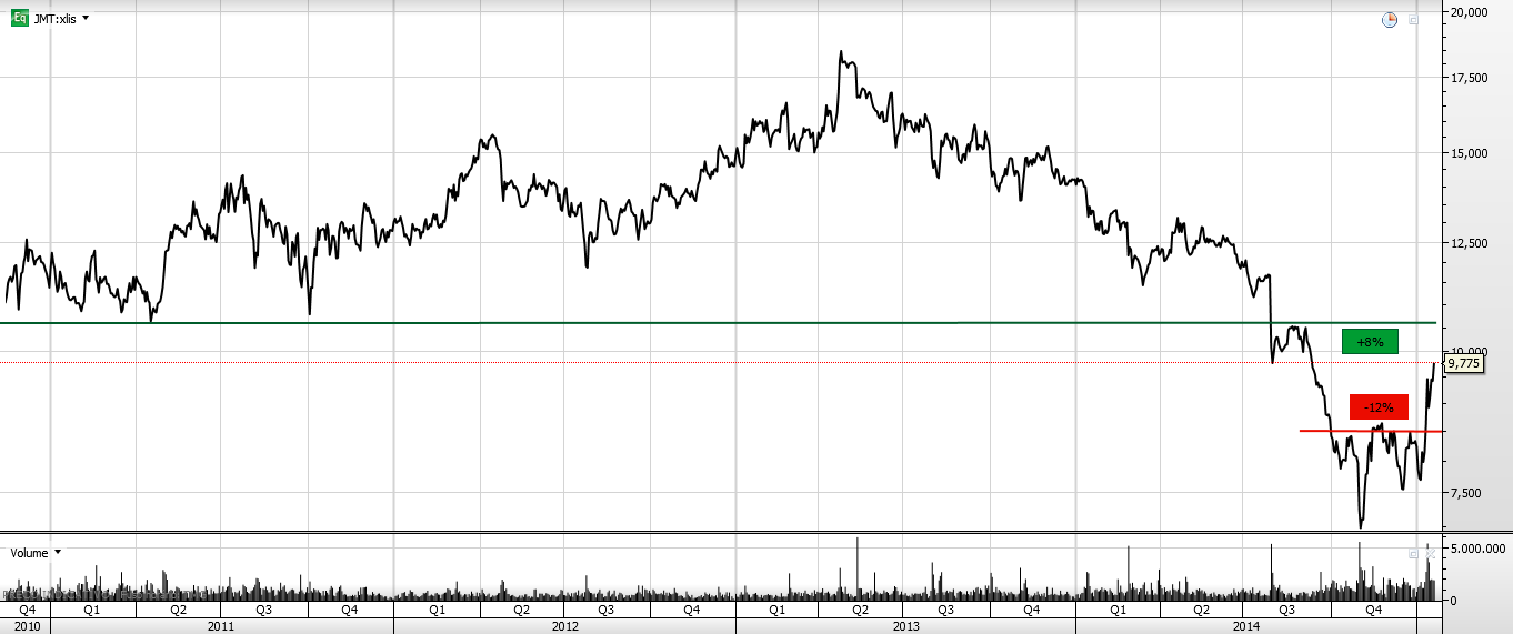 A JM andou a consolidar desde Outubro de 2014 e rompe a primeira resistência como referido nos manuais, em gap up, quem entrou, entrou bem, quem quer entrar para o médio , longo prazo, deverá entrar com uma posição que lhe permita dormir descanso e com um stop na ordem dos 12%, a próxima resistência está 8% a cima.
