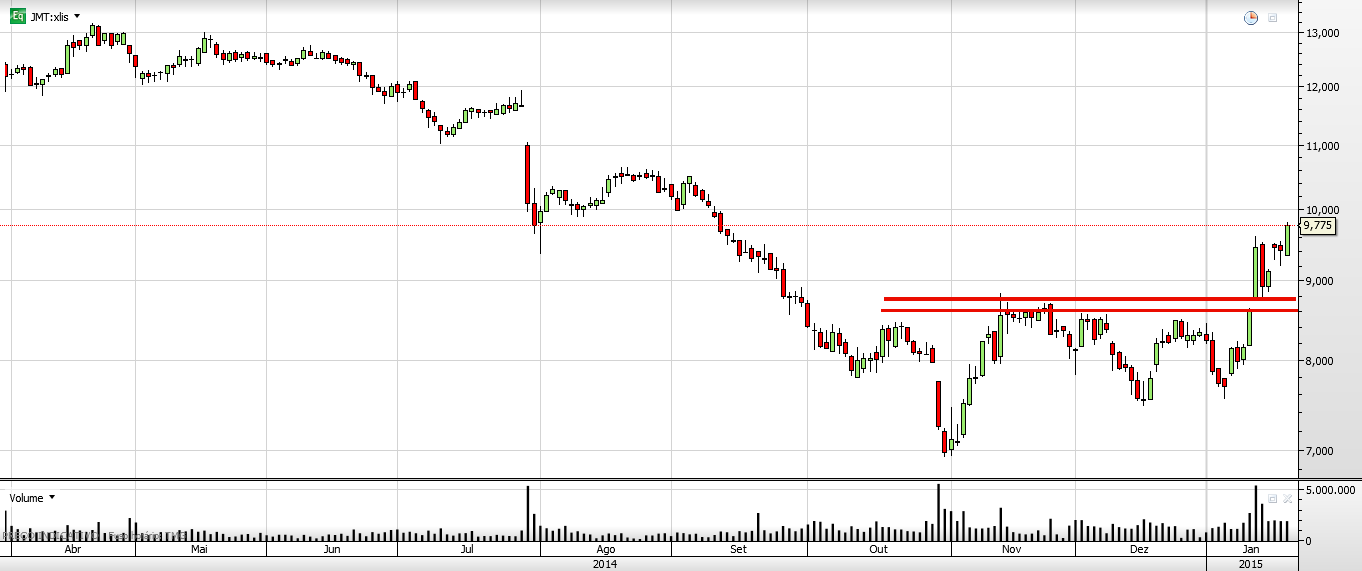 A JMT é um deles, com a formação de uma Bull Flag que pode ter continuidade caso o rompimento da MM200D seja efetivo.