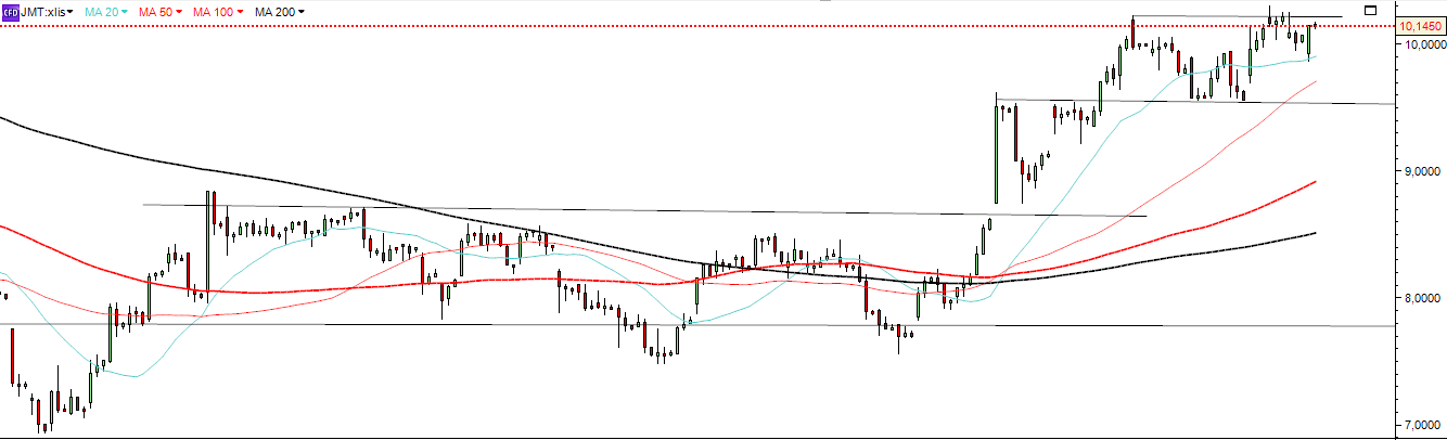 , e neste momento o caminho é de subida com suportes nos 9,544€; 8,736€ e 8,520€ com a próxima resistência mais forte a 11,187€. Mas atenção, hoje o fecho está em cima do campo de acção de uma resistência que se encontra nos 10,009€, por isso, amanhã vai ser um duro teste à JMT, será que ultrapassa definitivamente esta resistência e passa a ser suporte ficando só com a próxima resistência nos 11,187€? não se sabe.