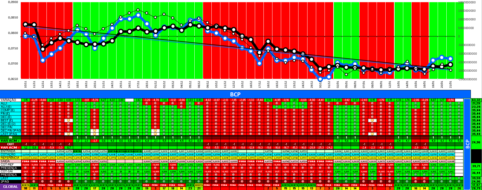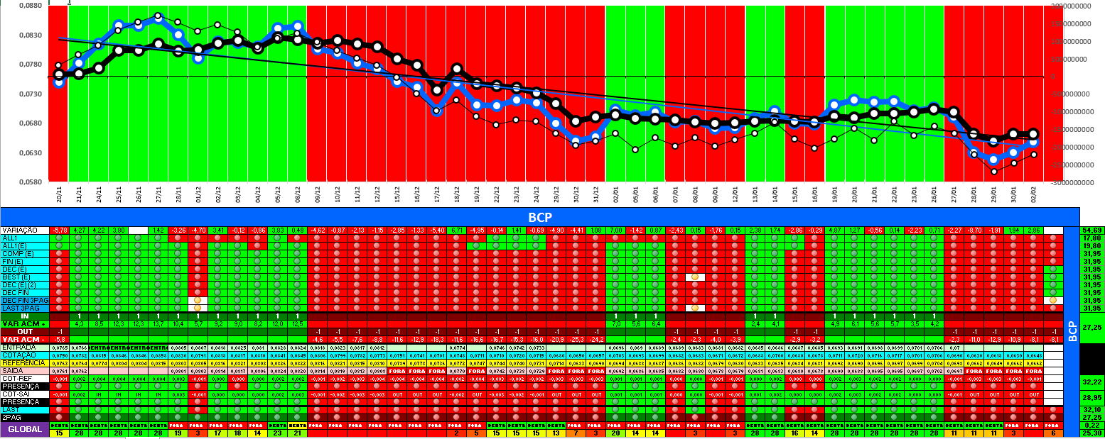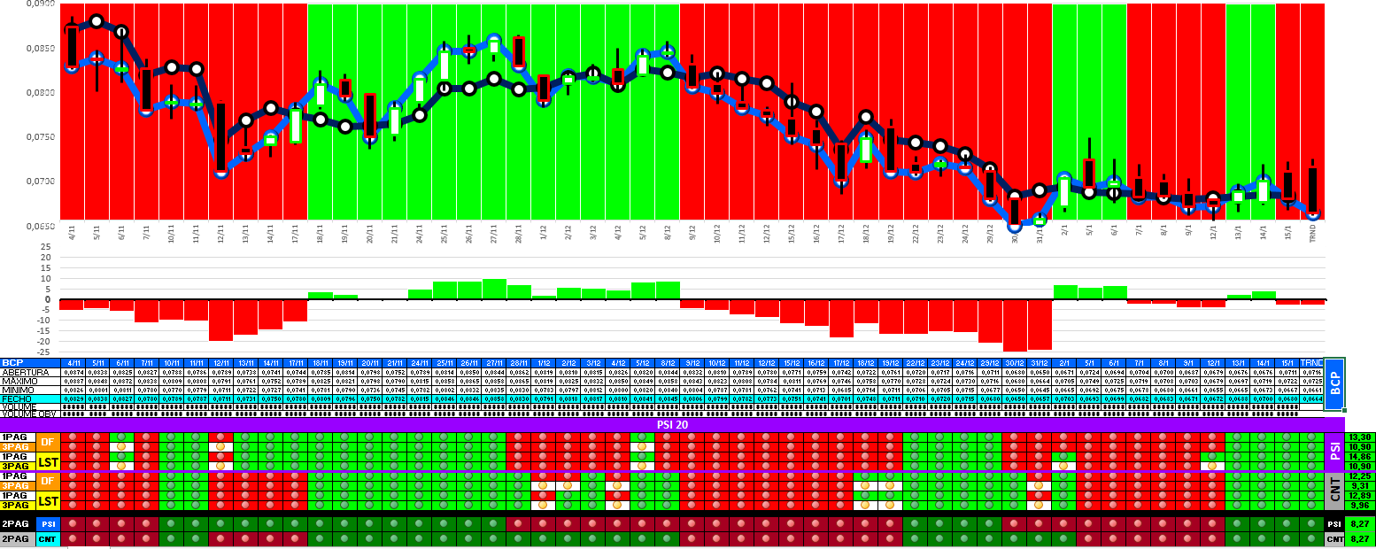 O modelo continua a dar sinal negativo para o BCP, mas nota-se uma indecisão latente. Diria que tudo depende da evolução de amanhã. Importa estar atento ao comportamento da banca (BPI e BANIF). Se o movimento positivo iniciado hoje pela globalidade dos títulos do PSI 20 tiver continuidade amanhã, então diria que estamos perante um sinal claro de entrada. Se pelo contrário, hoje foi só um fogacho, então o melhor é não entrar e continuar de fora a aguardar por melhores ventos e marés. Estamos no inverno e está muito frio para fazer windsurf