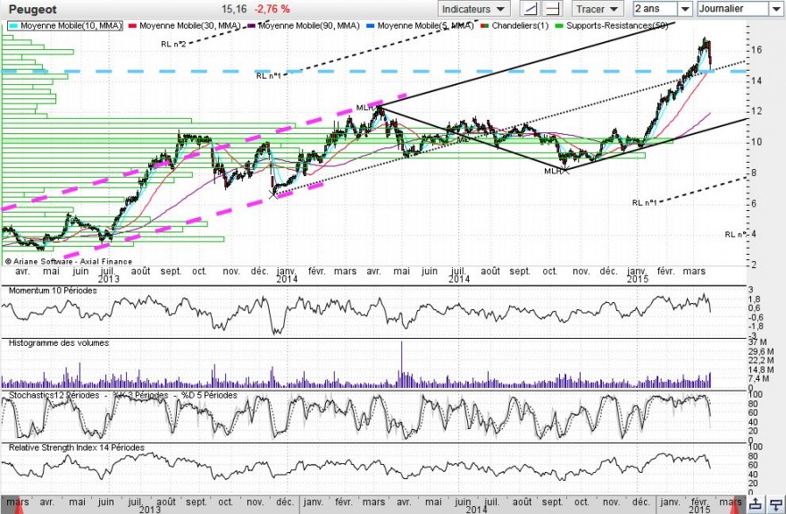 A peugeot com fortes possibilidades de quebrar esta ltd que vem desde Abril 2014, caso isso aconteça com forte volume poderá no curto prazo chegar à zona dos 12€, neste momento já cota acima desta linha, mas ainda muito tempo para o fecho, e um fecho abaixo desta linha pode fazê-la descer novamente à zona dos 10€. A minha tentativa de analise para o curto prazo.