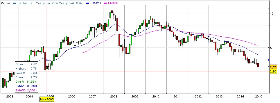 Vale - Benchmark para dezenas de ações brasileiras ligadas aos minerais, siderúrgicas e exportadoras (da Sid, Braskem à Gerdau, existem imensas ações que seguem e "alavancam-se" sobre este benchmark). Forte bear market.