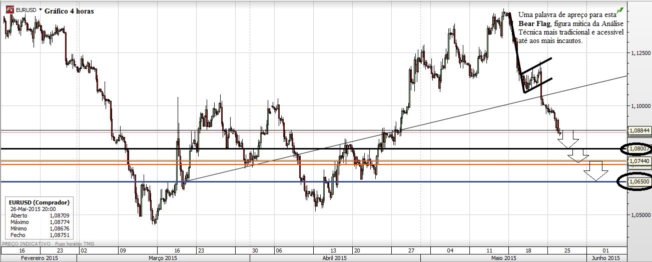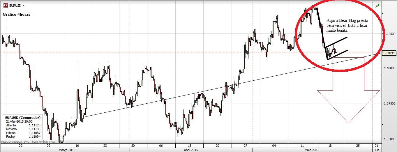 Hoje o EURUSD fez uma bonita vela (para quem está curto naturalmente, embora feia para o lado longo) mas o mais importante neste momento é o facto de se estar a formar uma bonita Bear Flag. É verdade que as bandeiras também falham, mas esta parece que promete...