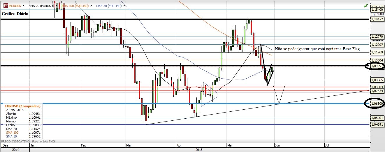 O que é um facto é que se encontra uma Bear Flag no Gráfico Diário. É preciso ter em atenção que a vela mensal ainda não está completa, visto que hoje ainda é dia 31. Também seria bom que os 1,10 não fossem quebrados.
