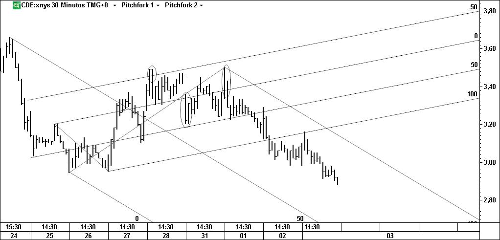 A entrada, vendedora ou compradora, já se deu (ordem de compra/venda no 3º toque). O padrão não está activado? Quero lá saber: se tiver um bom r:r, sei que posso estar errado 70% das vezes e mesmo assim ganho. As linhas horizontais de cima (baixo) são os targets.