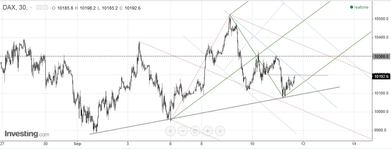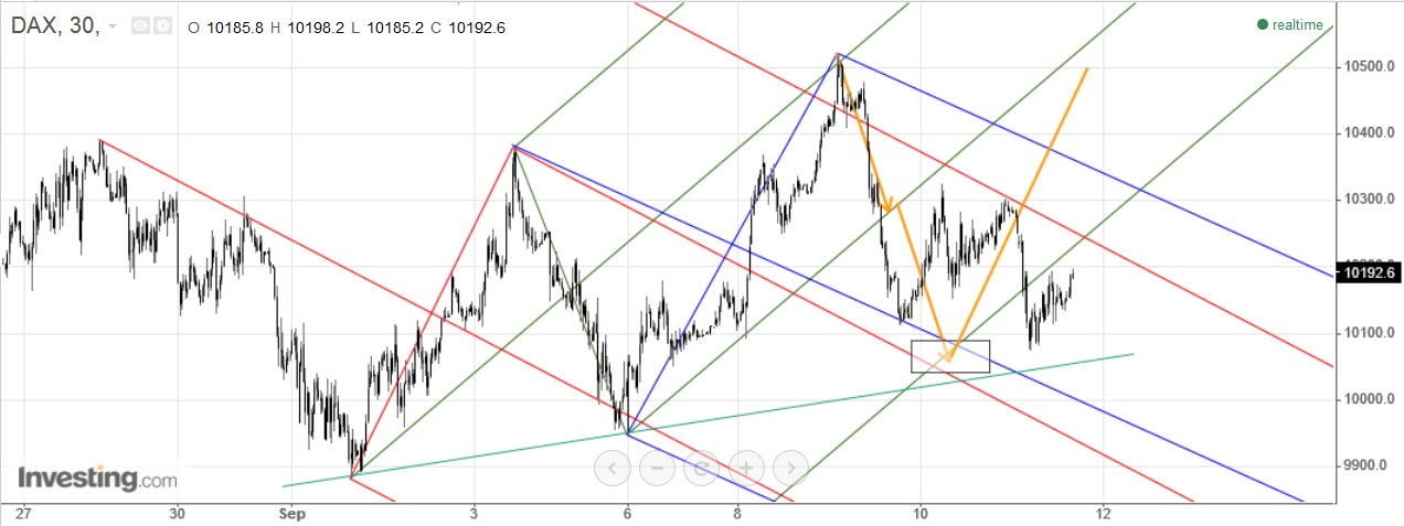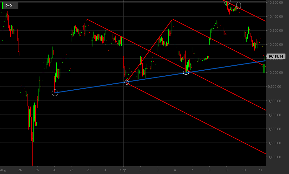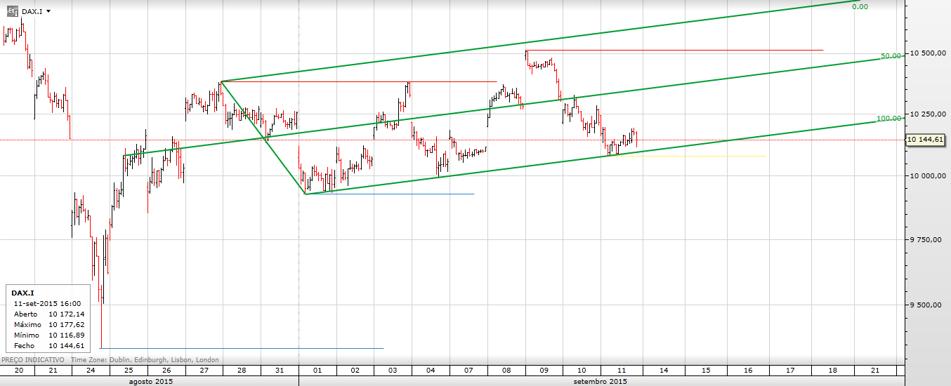continuando para o gráfico 2: reajustei a "linha colectora" aos novos mínimos nos 10070 e acrescentei outras linhas. a fork vermelha a "ponteado" é apenas para avisar que ela está lá, neste momento dou mais importância à verde - porquê? lembro-me de uma "rule of thumb" do Tim Morge na qual ele diz que a partir do momento em que 2 swings são ultrapassados, é hora de traçar uma fork ascendente. essa regra, por assim dizer, faz todo o sentido, pois é uma demonstração significativa de força do preço. neste sentido, este último swing high que chegou à zona dos 10500 ultrapassou os 2 anteriores que se tinham ficado pelos 10400, e daí a fork verde, cuja median line tem 2 toques mais ou menos correctos. ainda será cedo, no entanto, para dizer se será válida, faltando um teste à lmlh.