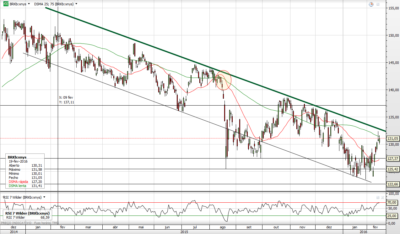 De um ponto de vista de análise mais ao comportamento de mercado, o mercado olha para os 1,2x o book value como o valor em que o buffett considera a acção como substancialmente subavaliada e em que começa a recomprar acções em força, por isso desde que a empresa colocou esse limite a acção nunca mais passou abaixo dos 1,2x o último book value reportado. Actualmente está entre 1,2 e 1,3x o valor reportado em setembro, como em breve reportam os dados do final do ano se tiver havido um ligeiro crescimento a acção estará ainda mais em cima da linha. Ou seja, no fundo há uma espécie de resistência não em termos de preço mas de múltiplo do book value abaixo do qual é muito difícil cair