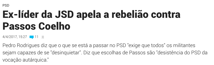 https://www.publico.pt/2017/01/18/opiniao/noticia/o-psd-ameaca-tornarse-numa-geringonca-1758664 Escreveu:O PSD não precisou de fazer alianças contranatura para se transformar por iniciativa própria numa outra “geringonça”. A reacção do partido à redução da Taxa Social Única (TSU) é um monumento à volatilidade política, uma homenagem à incoerência programática, um apagamento da memória, uma vénia ao oportunismo, uma submissão à vertigem do equilíbrio instável, que ora o leva a ser quem é, ora o move a procurar identidades alternativas que lhe permitam dizer “eu existo”. A apresentação de tecnicalidades pertinentes ou as farpas justas que o PSD tem lançado a um Governo estranhamente em paz com os aliados que lhe estragam os planos e cinicamente em guerra com o principal partido da oposição não iludem o essencial: a credibilidade e a coerência do partido ficaram em causa com o anunciado chumbo à descida da TSU. O PSD regressou ao passado e tornou-se um partido de humores. Por estes dias mostra-se irritadiço, instável, nervoso, agressivo, sem desígnio, projecto ou identidade programática perceptíveis, capaz de dar cabo da Concertação Social mais por birra do que por divergência substancial. Razão tem Marques Mendes: este é o maior erro de Passos desde que está na oposição.