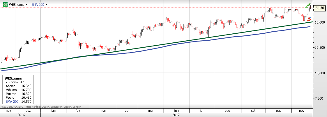 A Wess fez máximos hoje, ação muito bull, com o stop no suporte recente. A venda com eventual lucro será quando se perspetivar uma inversão de tendência, com fundos mais baixos. O stop vai subindo à medida do movimento, tendo como regra: corta os prejuízos e deixa correr os lucros.