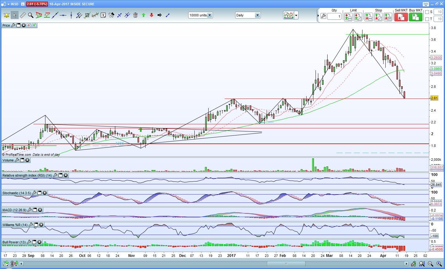 A Inside Secure chegou hoje ao seu suporte mais importante. Durante a sessão negociou a valor abaixo do suporte, mas acabou por fechar quase em cima do suporte.