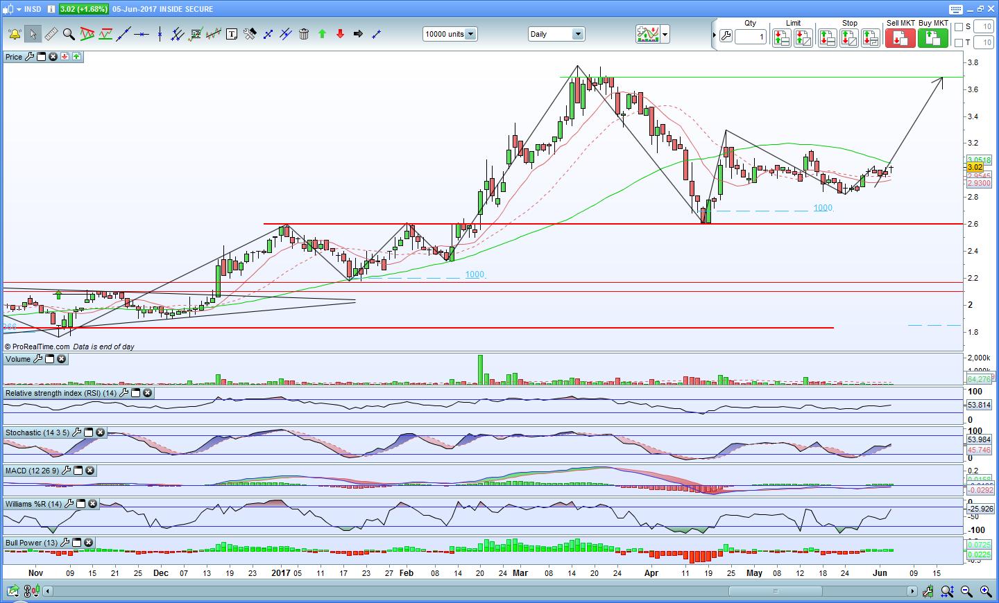 Como a Inside Secure se encontra em Bull Market, existe uma forte probabilidade de visitar de novo pelo menos os 3,7€. Mas o mais importante é que não quebre em baixa o suporte nos 2,6€, pois para mim isso significaria uma mudança de tendência.