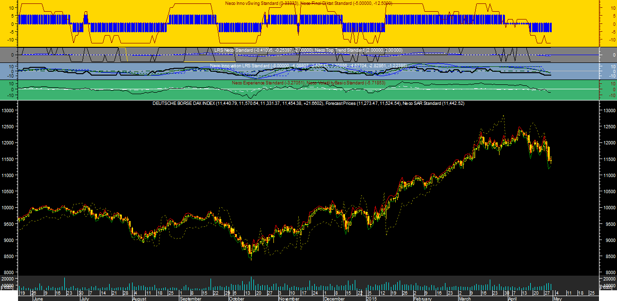 Assim deixo de novo ficar um exemplo recente, neste caso o DAX, com o diagnóstico do referido sistema de trading, curiosamente a sair da posição longa no dia 31 de março aos 11.966 pontos depois de ter entrado longo em 16 de janeiro aos 9.986 pontos, precisamente há mais de 1 mês atrás, e a entrar em curtos no dia 17 de abril nos 11.736 pontos, há cerca de 10 sessões atrás. Atualmente o DAX navega pelos 11.454 pontos.