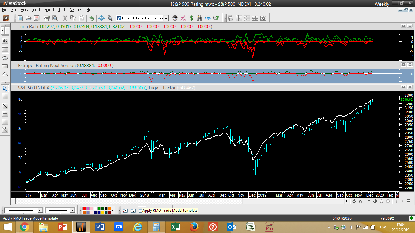 Por exemplo, em vez de considerarmos que na última barra o valor semanal do S&P 500 valorizou de facto em relação à barra anterior o valor real percentual de (3240,02-3221,22) / 3221,22 x 100% = 0,58%, os indicadores de valorização potencial da última barra apontam pelo contrário para um valor total relacionado com as somas de todas as parcelas dos indicadores do quadro de cima: 0,01297% (peso da abertura em relação ao fecho da barra anterior) + 0,0517% (peso da evolução da barra entre a abertura e o meio da sessão semanal) + 0,07404% (peso entre o meio da sessão e o seu fecho) + 0,18384% (peso da previsão da evolução normal do mercado para a barra seguinte, por extrapolação linear) = 0,32102%.