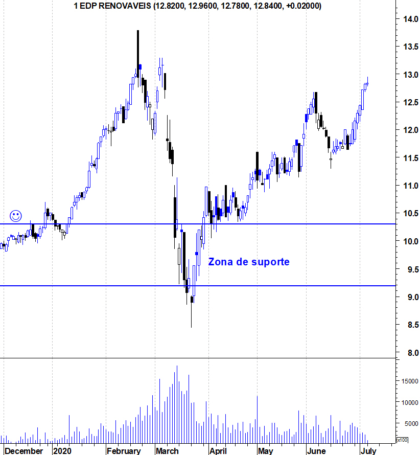 A EDP Renováveis está a cerca de 2,5% do seu máximo histórico em fecho (o intraday é bem mais alto, bem visível naquela enorme vela negra no gráfico). Na verdade a acção continua o mais longo "Bull Market" da Bolsa portuguesa. São já 8 anos de tendência ascendente, algo raro na nossa Bolsa.