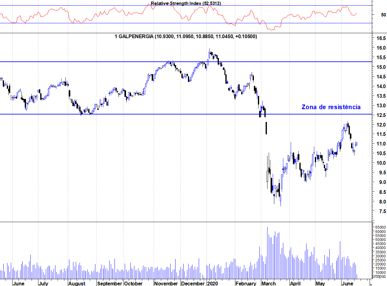 Deixo o gráfico actualizado da Galp que avançou até junto da resistência e depois inicio uma reacção natural. Aquela zona de resistência é, para mim, a fronteira entre o "Bear" e o "Bull Market" na Galp.