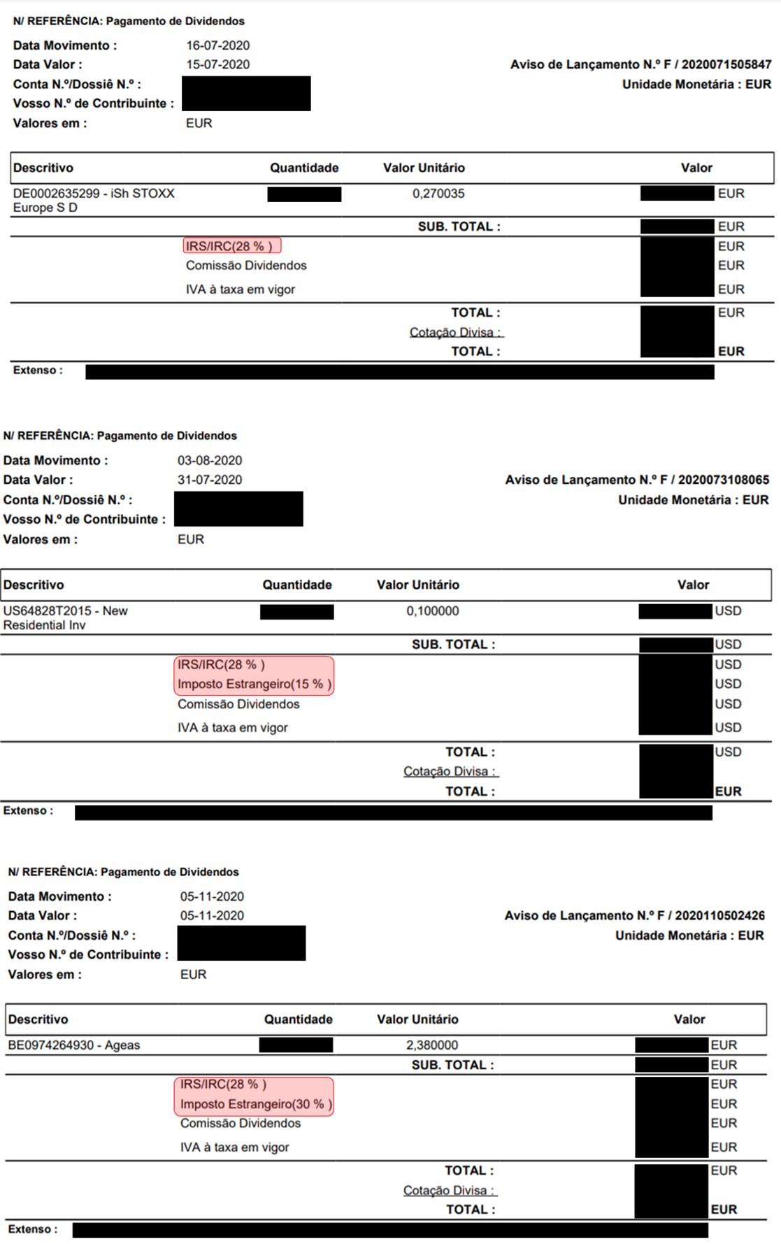 As zonas sublinhadas a vermelho da seguinte imagem (comprovativos de pagamentos de dividendos) ilustram estes exemplos que referi (1º dividendos provenientes do ETF da Alemanha taxados a 28%, 2º rendimentos provenientes dos EUA taxados a 28% +15%, 3º rendimentos provenientes da Bélgica e taxados a 28% +30%):
