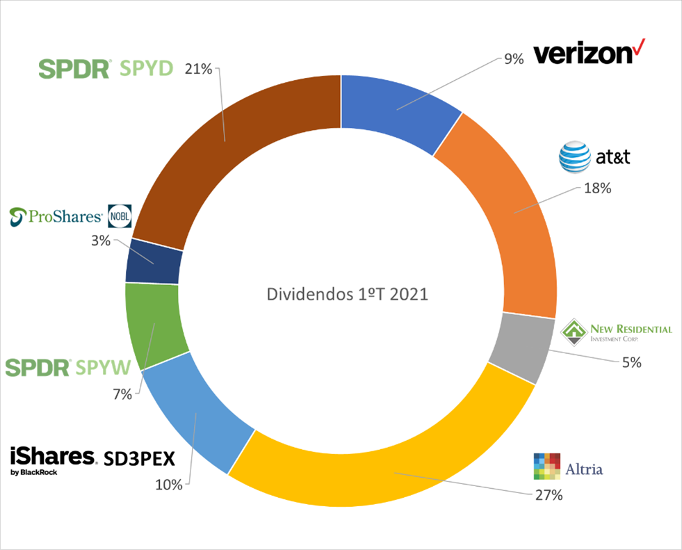 Neste primeiro trimestre do ano, o novo capital investido foi de 28% dos quais 11% foi capital recebido de dividendos e que desta forma foi reinvestido no mercado. Este novo investimento permitiu-me aumentar a diversificação da carteira. O portefólio é agora constituído pelas seguintes posições:
