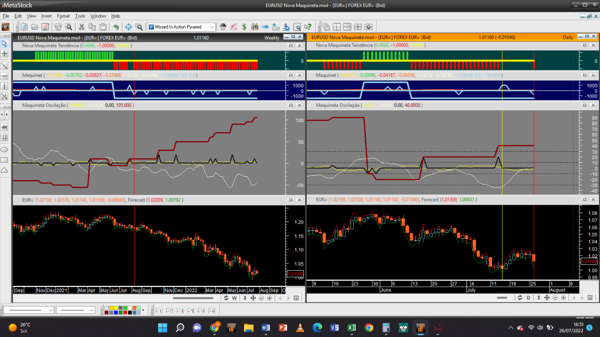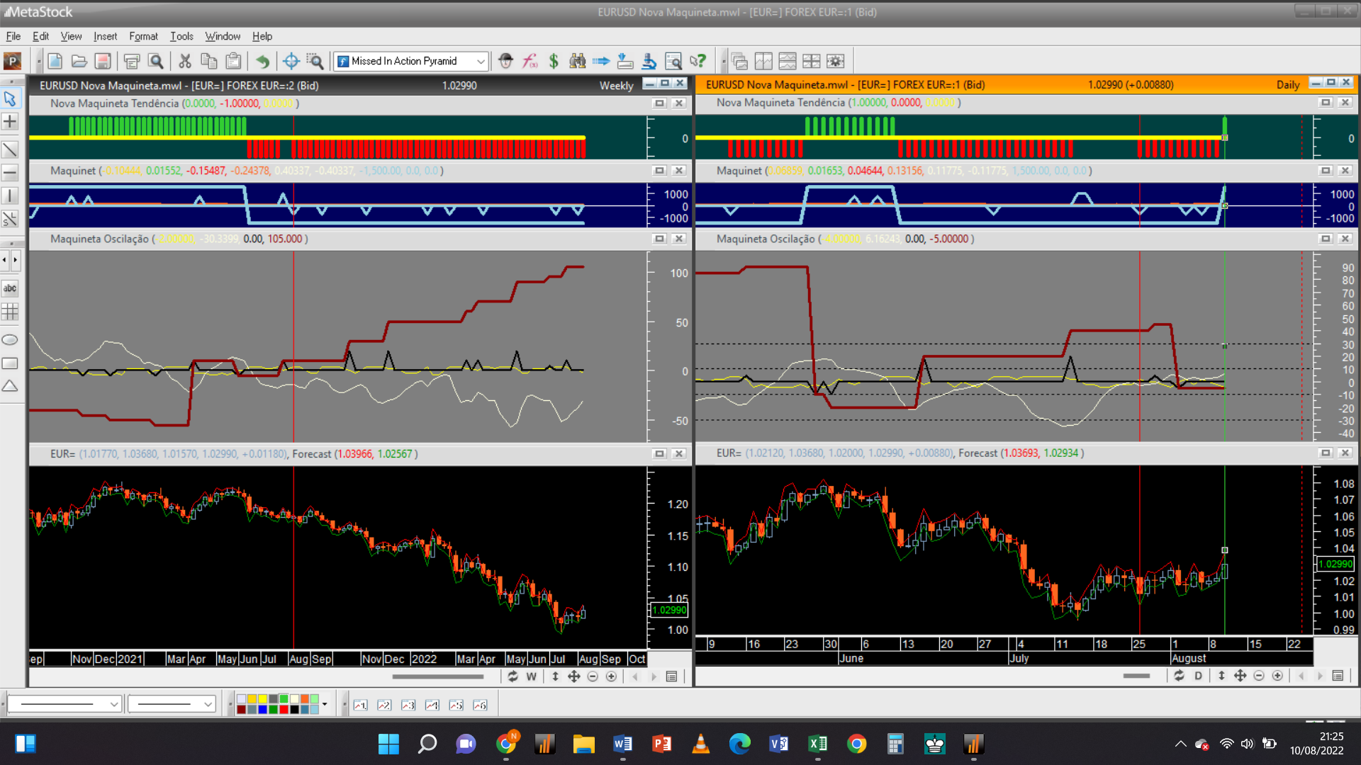 No layout abaixo, que inclui os gráficos semanal e diário do EuroDollar há um sinal na escala diária de inversão de tendência de negativa para positiva.