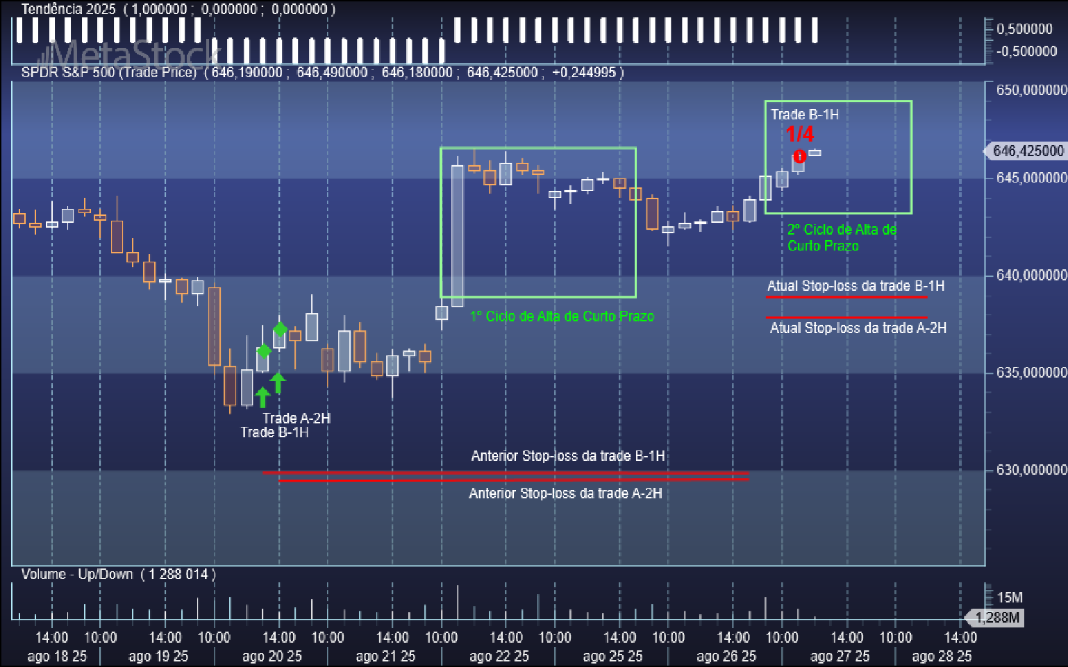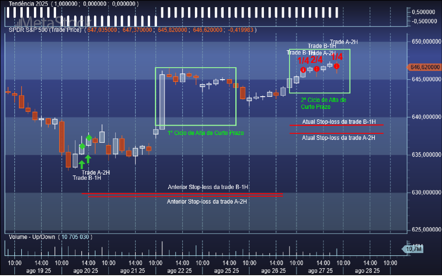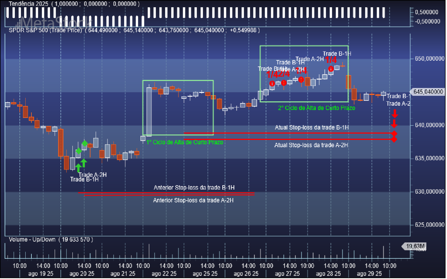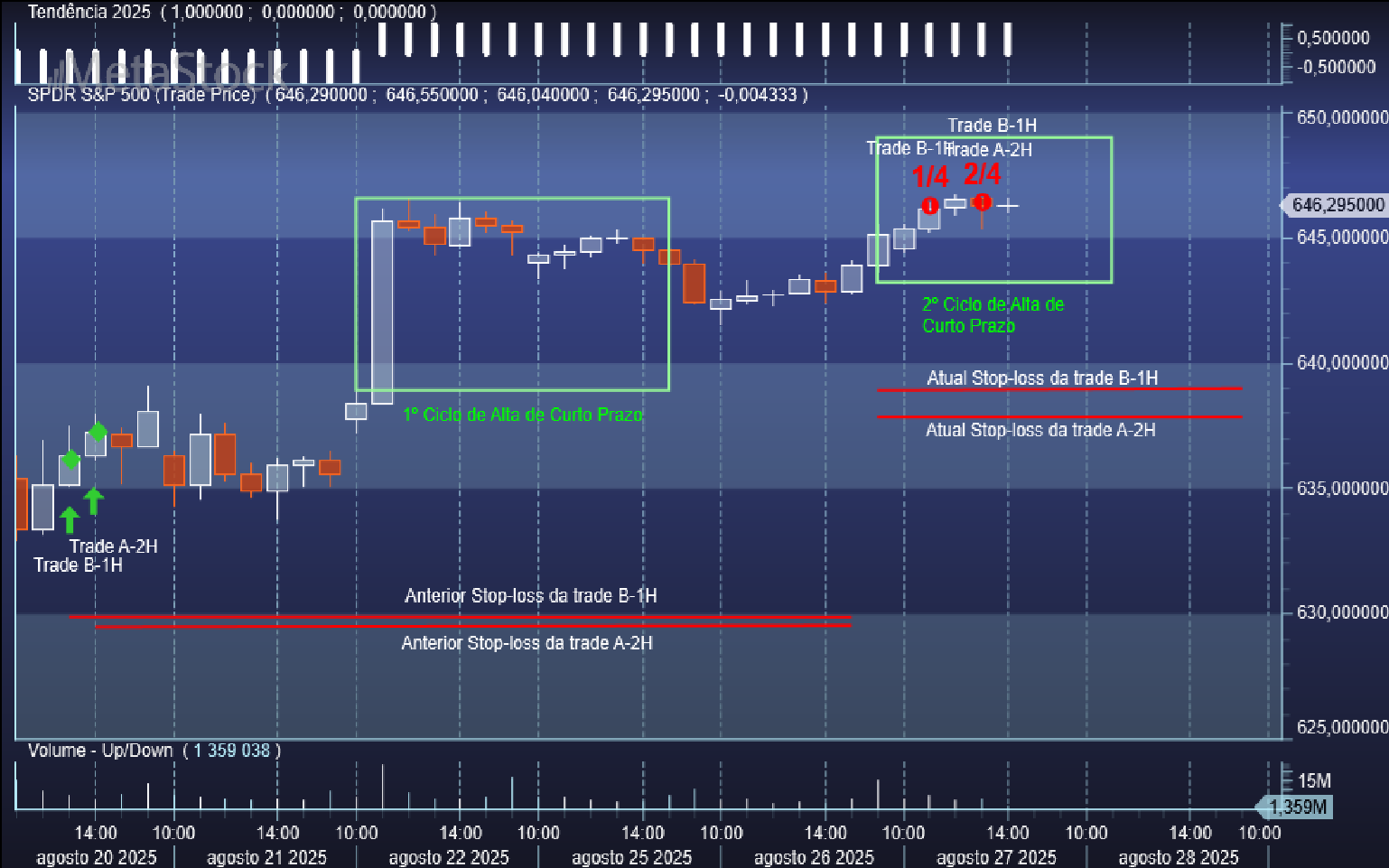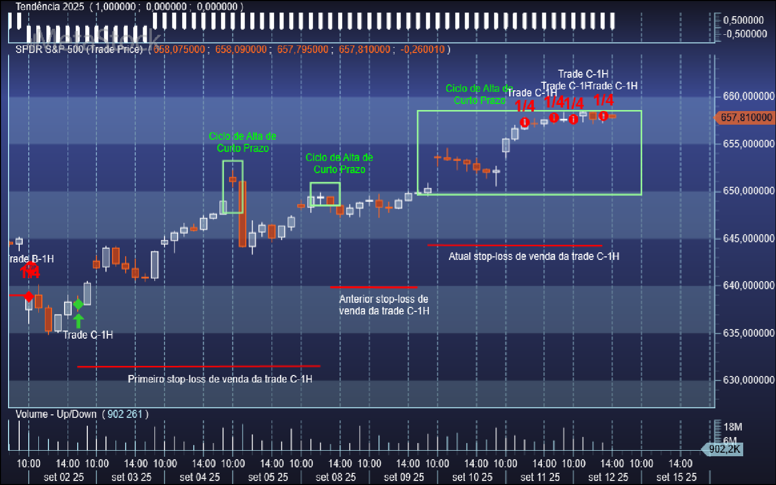 Quanto aos níveis de saída duma swing trade comprada já aqui tenho também referido a metodologia base: se a trade correr para o torto os stops serão acionados e se as coisas correrem a favor saímos em força nos ciclos ascendentes de curto prazo, preferencialmente dividindo a saída em frações de ¼, conforme podem ter observado nos posts anteriores nos casos recentes das trades B-1H e A-2H.