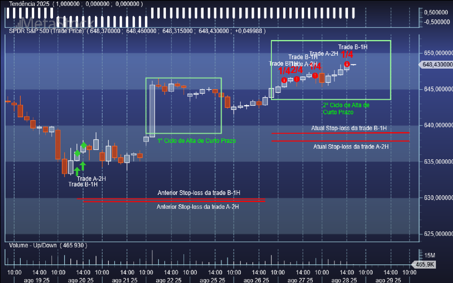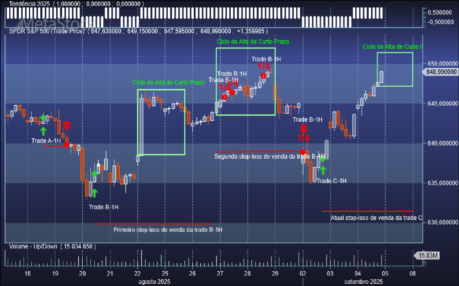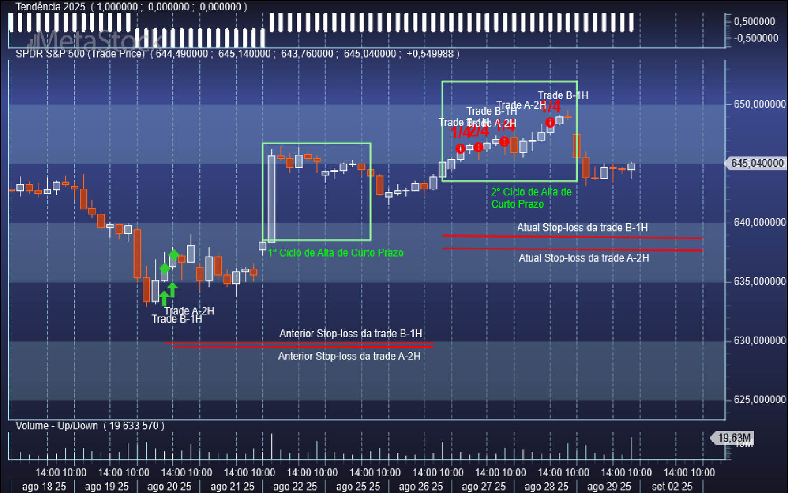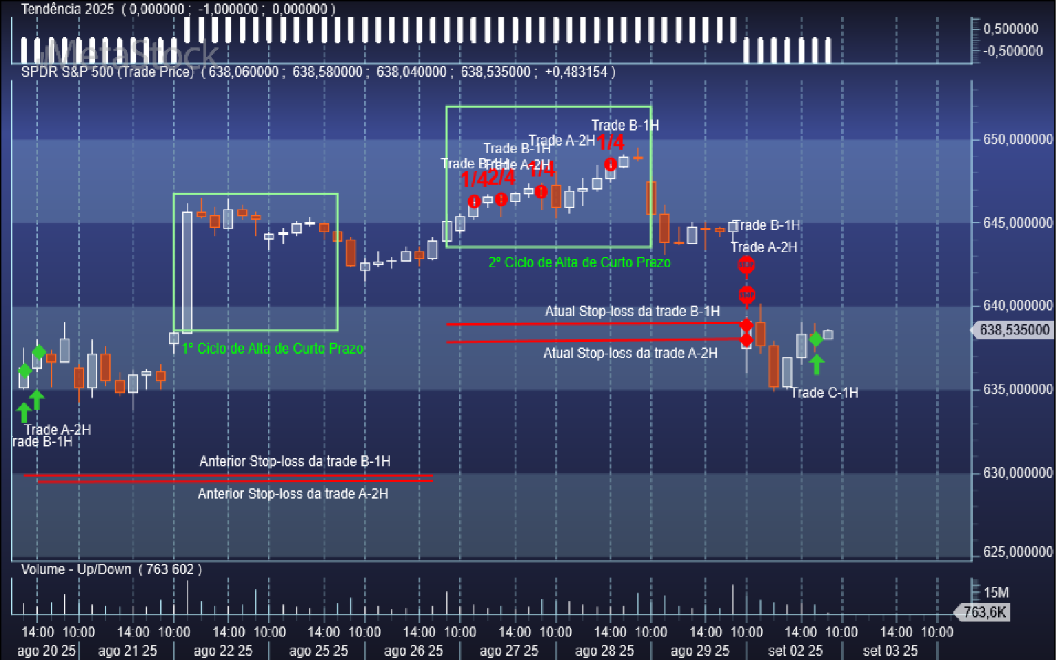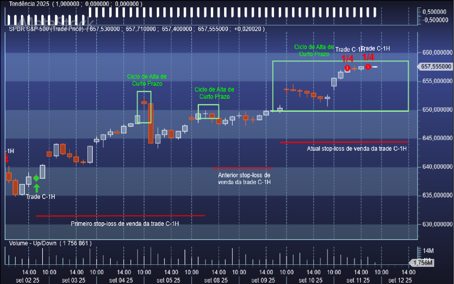 Aproveitando uma nova incursão corretiva do S&P 500 por territórios duma pequena baixa no seu ciclo oscilatório da escala de 1 hora, o sistema de trading sobe o patamar do stop de venda da trade aberta C-1H quando voltou a reentrar na zona do ciclo de alta de curto prazo, passando o respetivo valor de 6409 Usd/contrato para 6452 Usd/contrato.