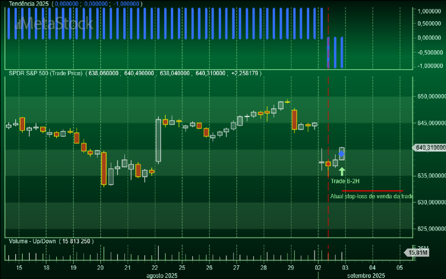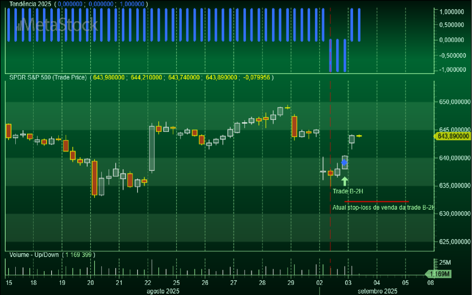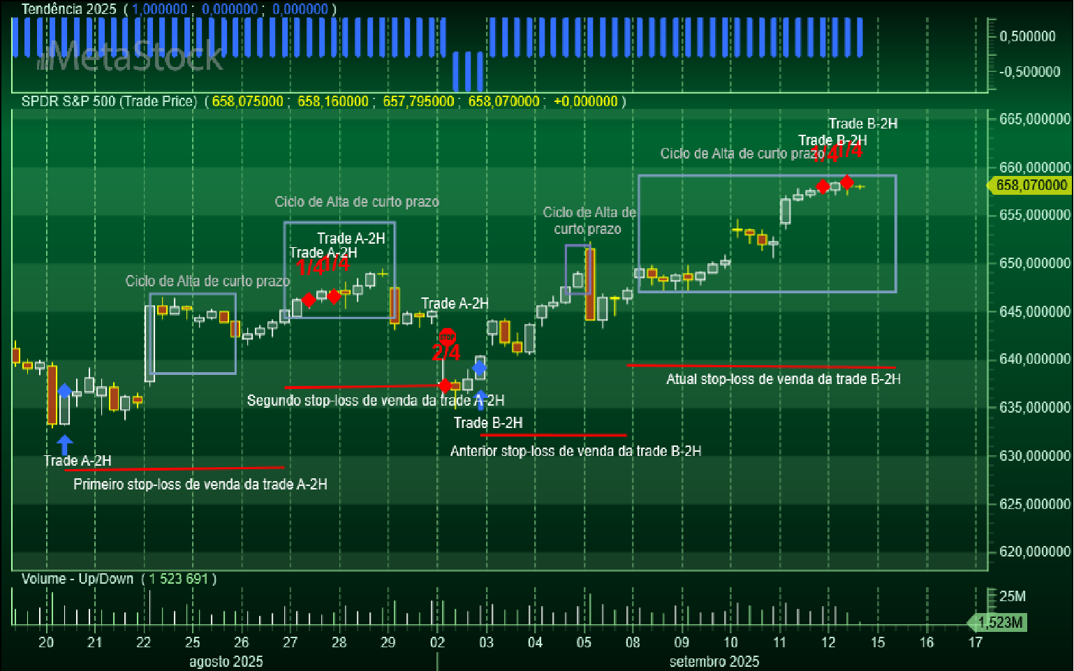 Para terminar o dia, precisamente ao fechar da sessão, a trade B-2H na escala das 2 horas acabou de encerrar a sua primeira parcela de ¼ da sua posição comprada ao preço de venda de 6583 Usd/contrato, a que corresponde uma mais-valia de +177 Usd/contrato.