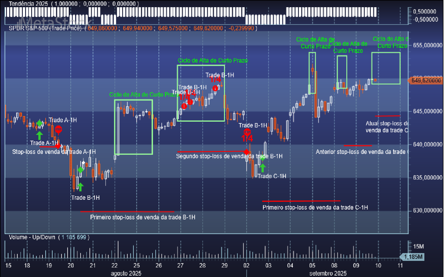 Nesta visualização pode-se ver o que aconteceu às trades fechadas A-1H com prejuízo e B-1H com ganhos, estando ainda em aberto a trade C-1H.
