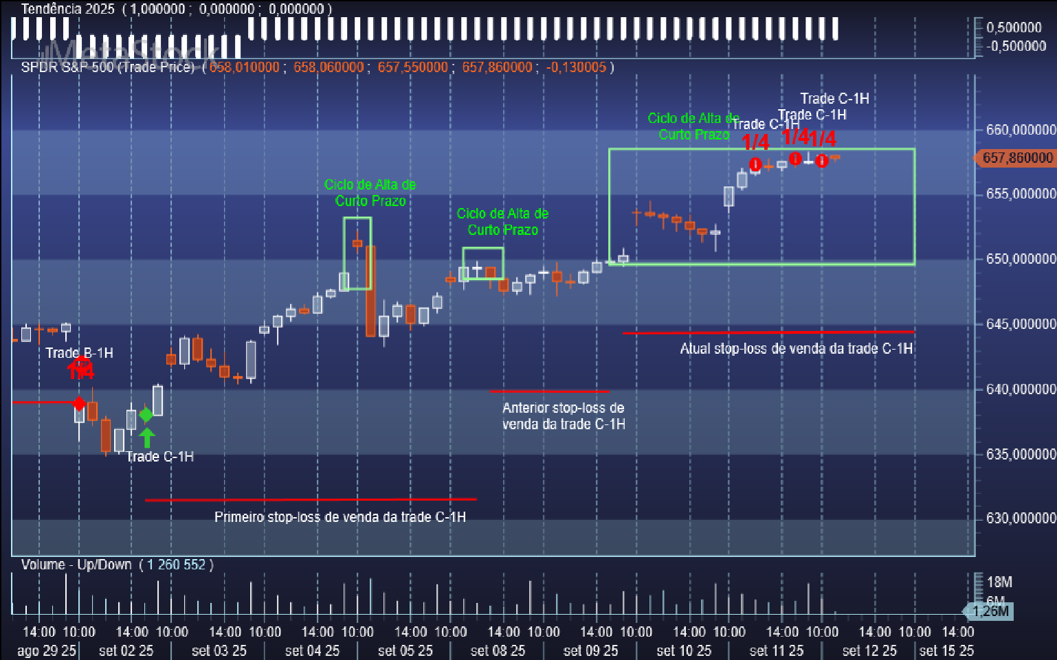 Neste cenário o programa acabou de disparar a sua 2ª ordem de venda em mais ¼ da posição comprada na trade C-1H na escala de 1 hora.