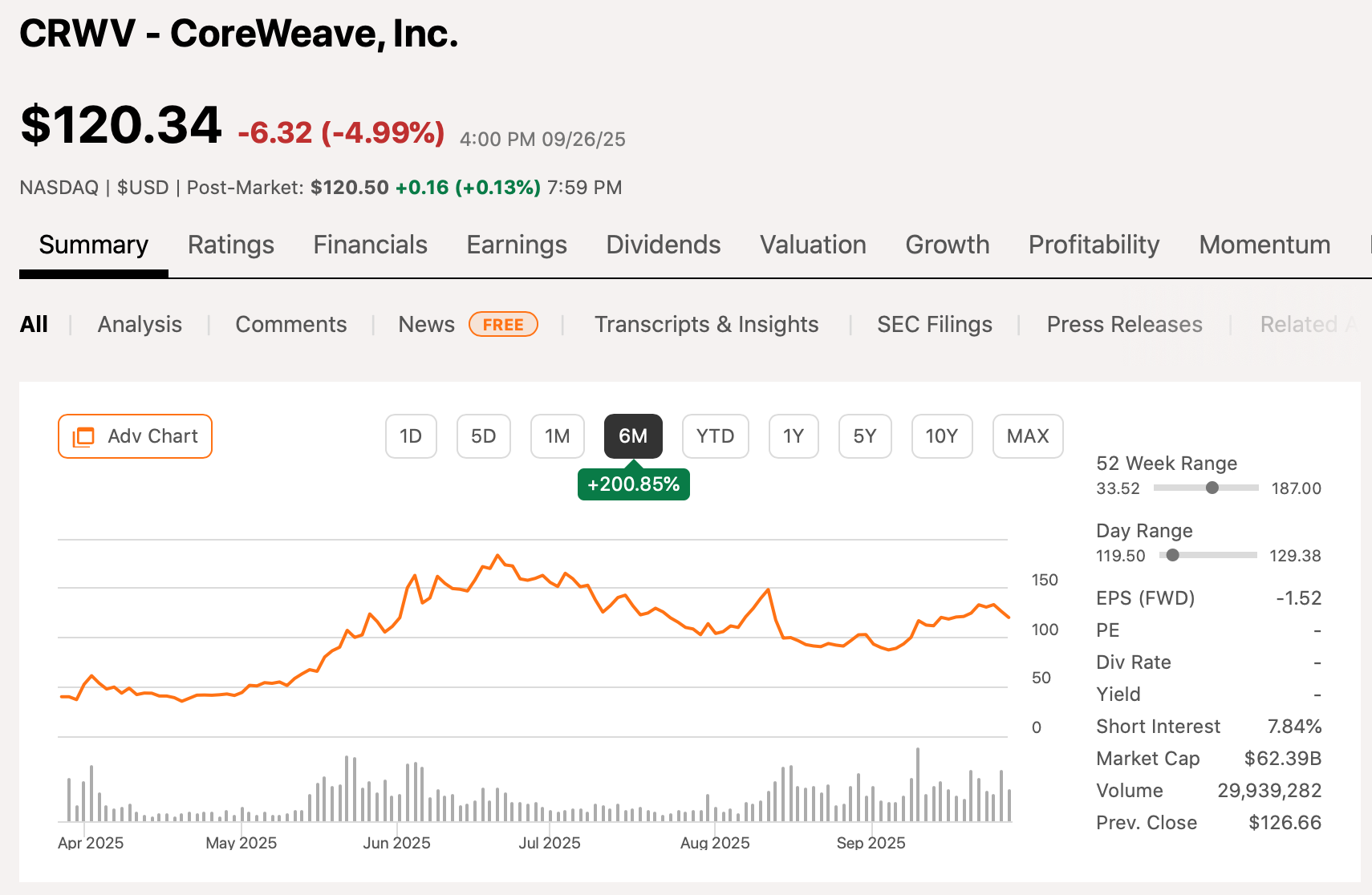Curiosamente, esta empresa funciona de forma oposta à quase totalidade das jovens empresas. As jovens empresas acumulam uma elevada posição de capital e depois operam em prejuízo, consumindo esse capital. A CRWV é o oposto. Apresenta margem operacional positiva e uma elevada dívida. A elevada dívida ( US$8 B em 2024) deve-se ao elevado custo de construção da infraestrutura. A empresa citar um valor de US$ 20-23 B para os investimentos em 2025. Apesar da margem operacional positiva, a empresa apresenta um prejuízo líquido elevado causado pelo peso de despesas financeiras (juros altos), amortização rápida de activos caros e remuneração em ações. Elevada dívida combinada com prejuízos anuais parece uma combinação fatal, mas parte significativa do prejuízo é sob a forma non-cash (emissão de ações e amortização de activos). A empresa tem capacidade para encaixar prejuízo enquanto continua a crescer e pode passar a fluxo de caixa positivo quando decidir reduzir os custos de investimento.