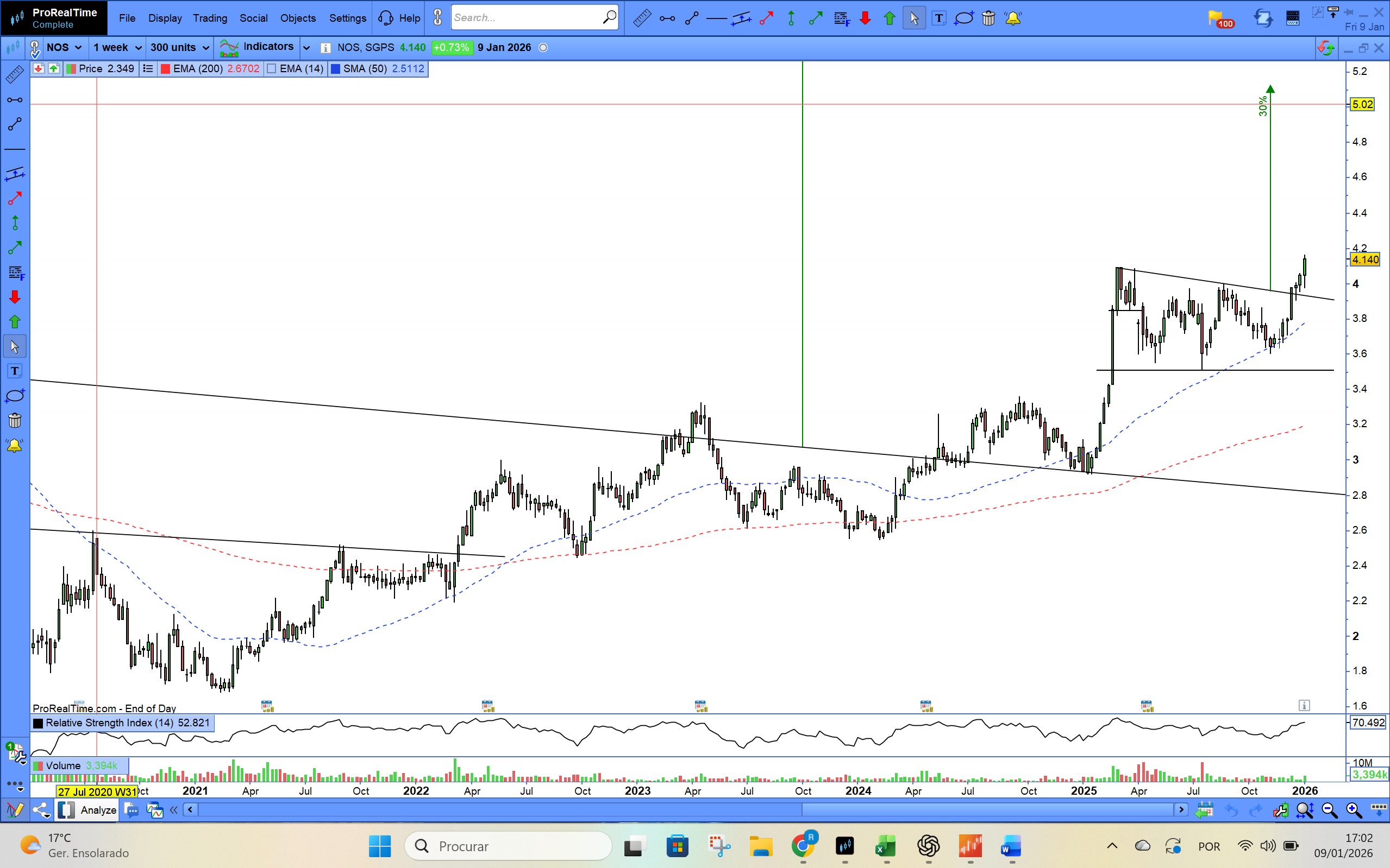 Como tínhamos uma lateralização entre 3,60 e 4 euros, faz assim sentido duplamente um target nos 4,40. E depois iria subindo mais sossegada aos 4,75 até Abril.