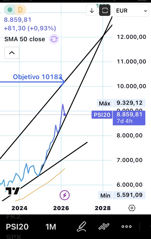 previsor Escreveu:O objetivo que marquei no PSI está em 10183 neste momento. Esse objetivo tem vindo a subir mensalmente até o preço tocar nessa linha. Isso aconteceu no bull market anterior e desde há alguns anos penso que vai acontecer de forma semelhante. Depois de o objetivo ser atingido, o preço tanto pode continuar a subir como descer uns meses antes de voltar a subir. No ciclo de subida anterior, desceu dois meses e depois subiu novamente.