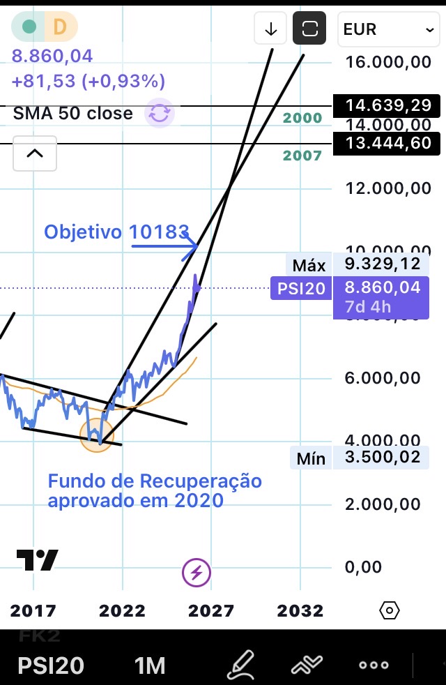 O objetivo que marquei no PSI está em 10183 neste momento. Esse objetivo tem vindo a subir mensalmente até o preço tocar nessa linha. Isso aconteceu no bull market anterior e desde há alguns anos penso que vai acontecer de forma semelhante. Depois de o objetivo ser atingido, o preço tanto pode continuar a subir como descer uns meses antes de voltar a subir. No ciclo de subida anterior, desceu dois meses e depois subiu novamente.