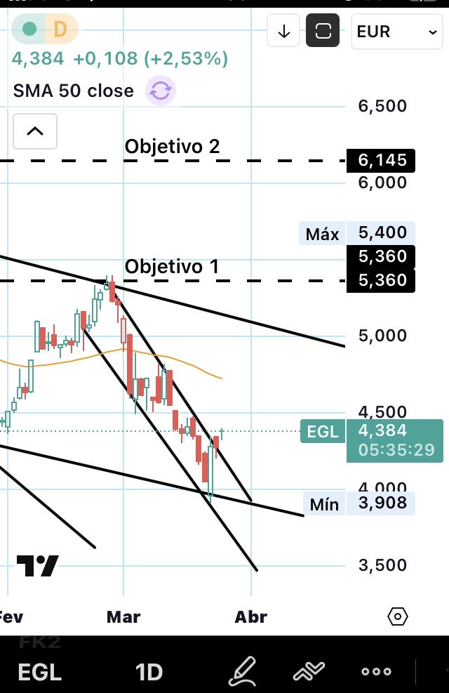 Este gráfico da Egl tem as mesmas linhas do gráfico de linhas que coloquei ontem, mas com o gráfico de candlesticks e mais aproximado consegue-se ver melhor que subiu depois de tocar nas linhas de suporte, e que ontem desceu até à anterior linha de resistência, que agora funciona como suporte, após a abertura em alta, e que hoje a subida está a continuar.
