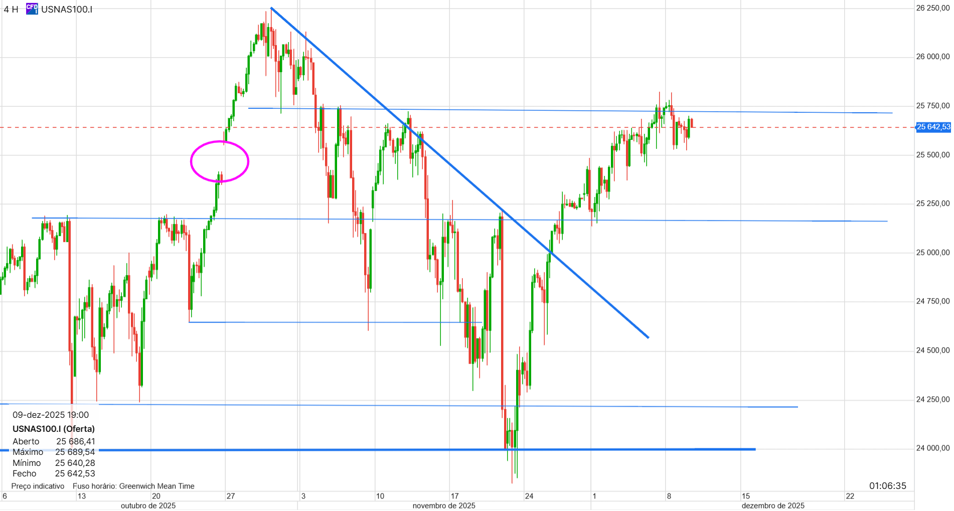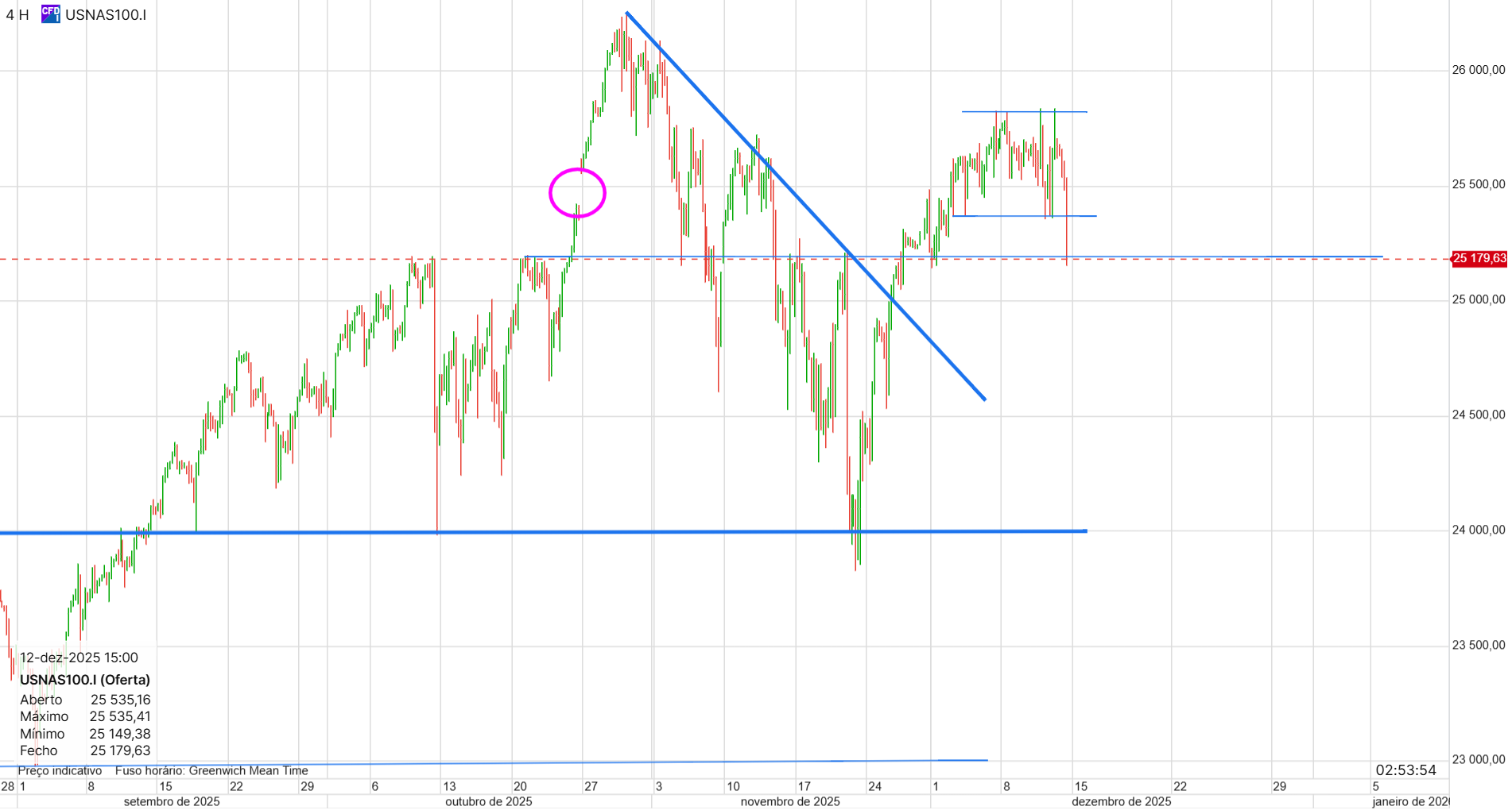 Acho que as linhas no gráfico de 4 horas fazem sentido, mas era difícil antecipar a lateralização. Acho que vai acabar por ir para cima, porque o Russell e o Dow Jones já fizeram novos máximos. Acho provável que o Nasdaq também faça, mesmo se descer na segunda e perder a linha de suporte no gráfico de 4 horas durante algumas horas ou um dia. O Nasdaq pode estar pior porque foi o que subiu mais, e há vários analistas a dizer que o impacto da IA pode não ser o esperado. No entanto, é difícil dizer se vai continuar assim ou se é momentâneo