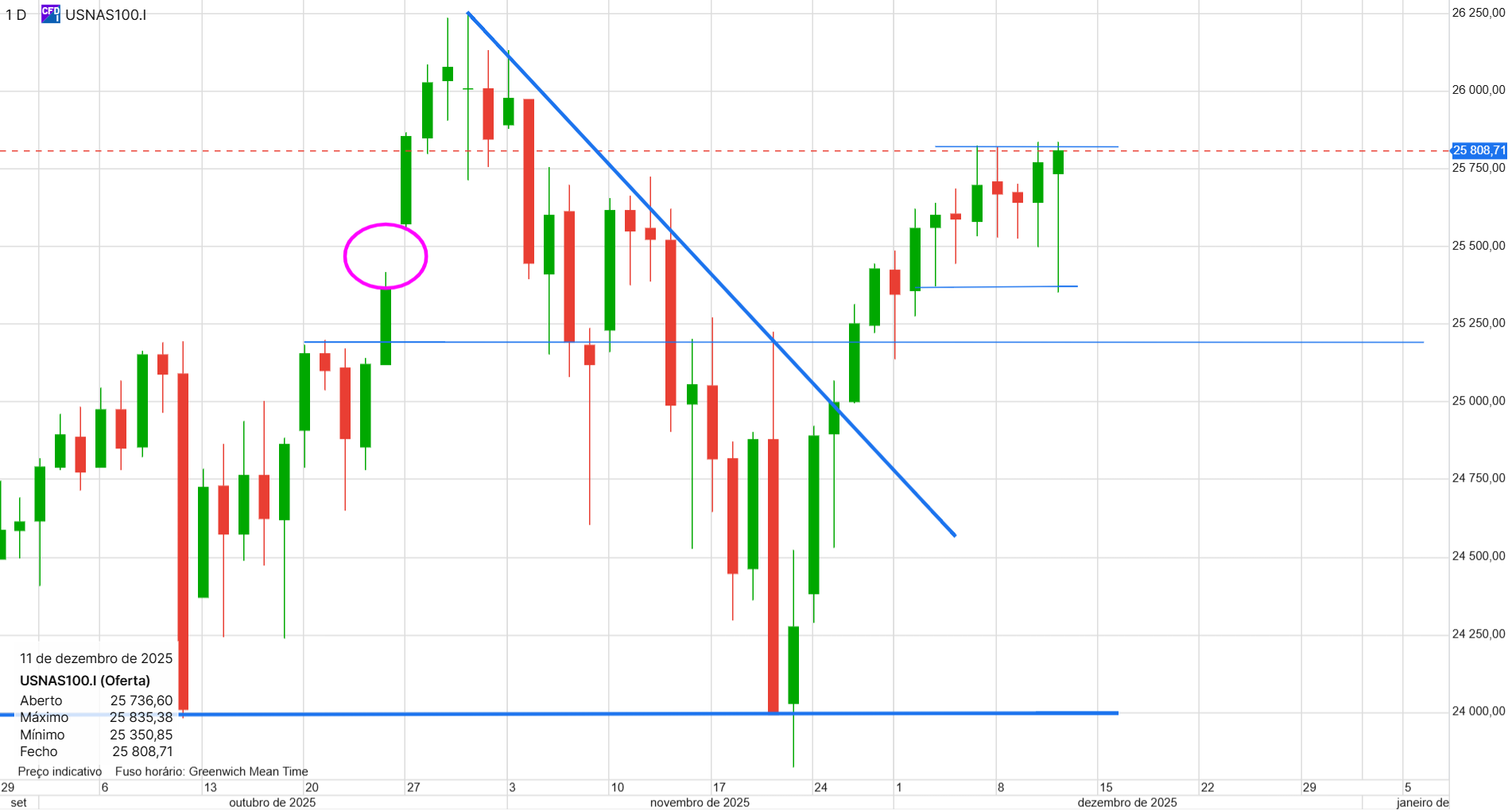 Isto bem negociado tinha sido uma mina, mas estava sempre com esperança que fosse para cima e já "borregou" 4 vezes nos 25800. Hoje fechou bem perto do máximo e a vela no diário tem bom aspeto. Vamos ver se é desta