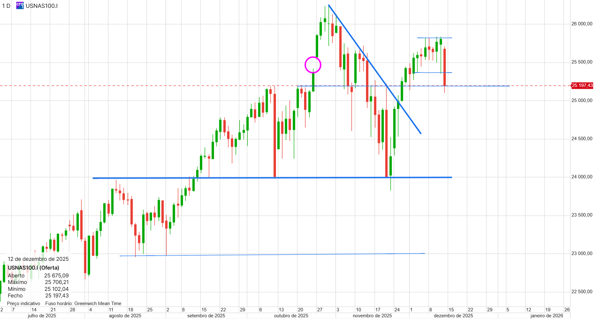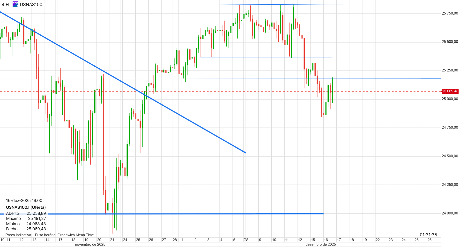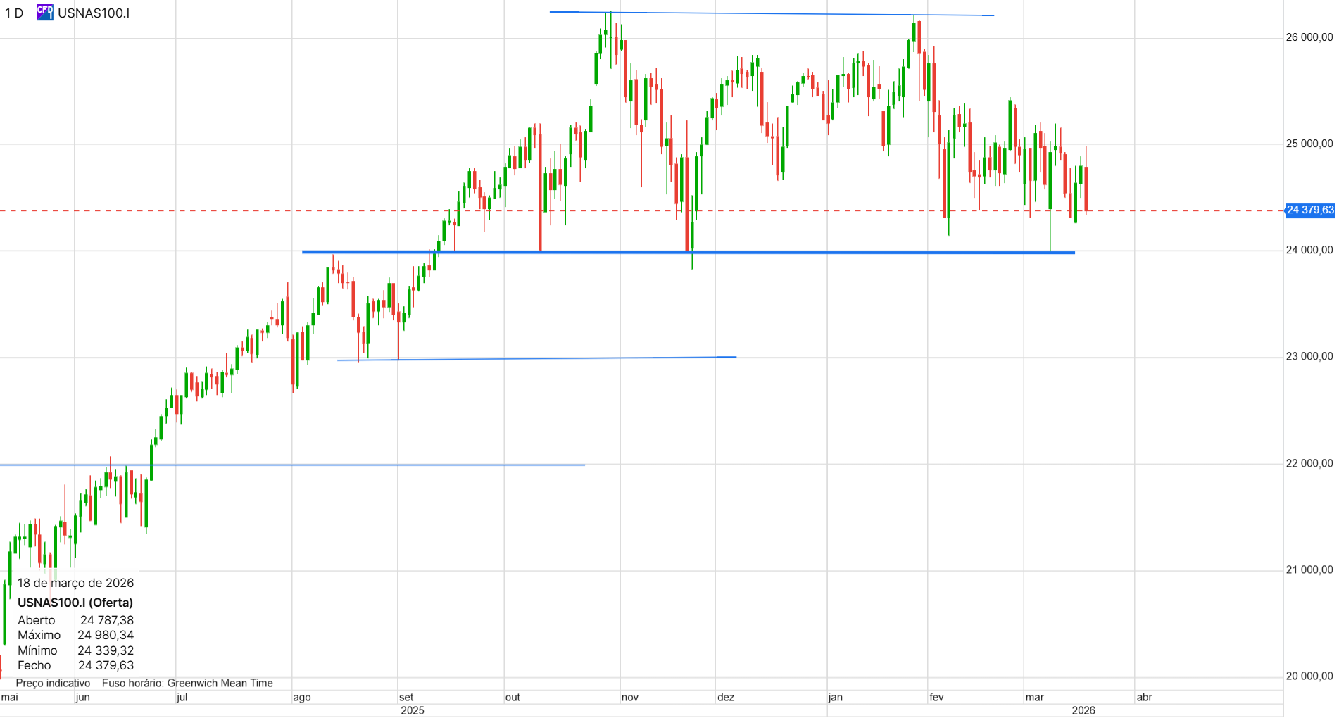 Não tenho posições, mas espero abrir uma longa amanhã (o ideal era fazer um teste aos 25200, seria o ponto ideal de entrada).