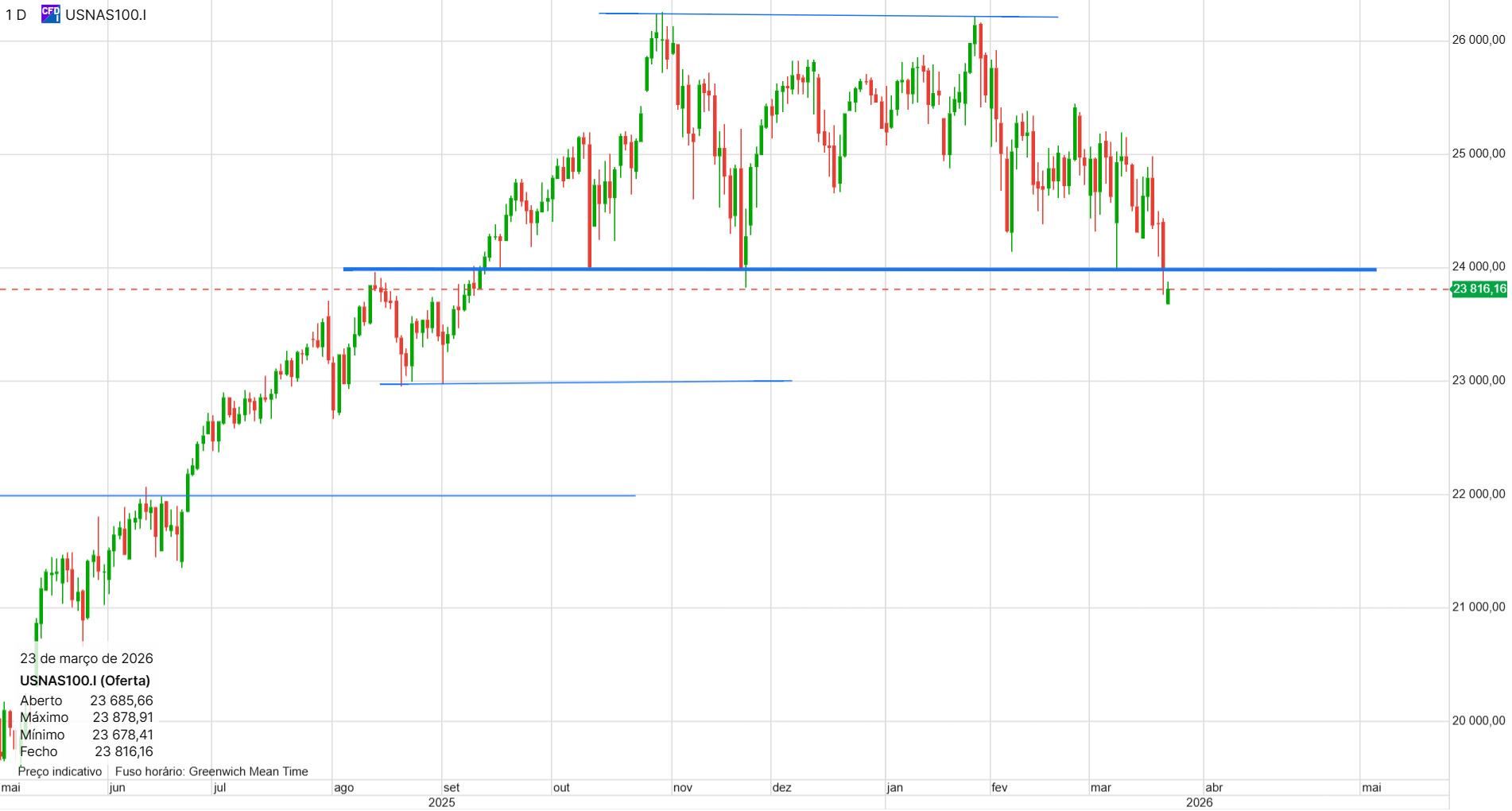 Gráfico diário. Sem grandes suportes até aos 24000. Mas se for até aí, temos um possível H&S. De qualquer forma a sessão ainda vai a meio