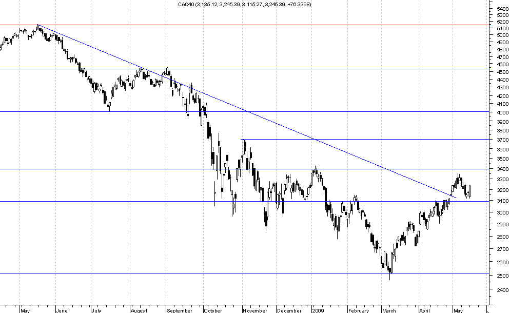 Incapaz de quebrar os 3.400 pontos o índice francês voltou a testar os 3.100 pontos reforçando a importância destes dois níveis que serão decisivos para o futuro do índice no curto/médio prazo.