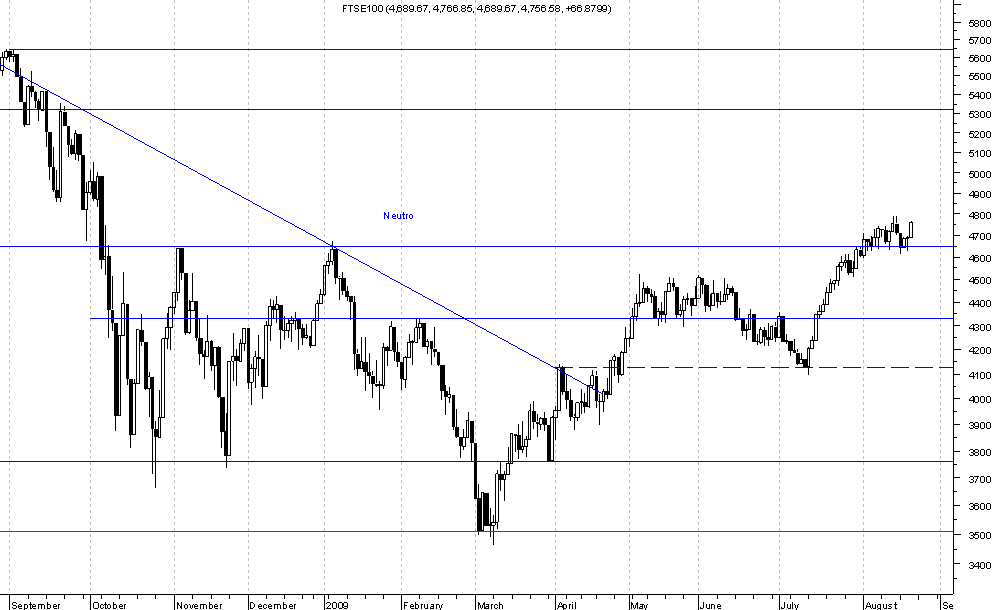 O Dax tem respeitado milimetricamente a análise técnica . Não conseguiu vencer a LTd de médio prazo e esta semana encontrou suporte na linha dos 4700 pontos. Momento de indecisão portanto. É necessário esperar a quebra de um deles para podermos saber para onde vai.