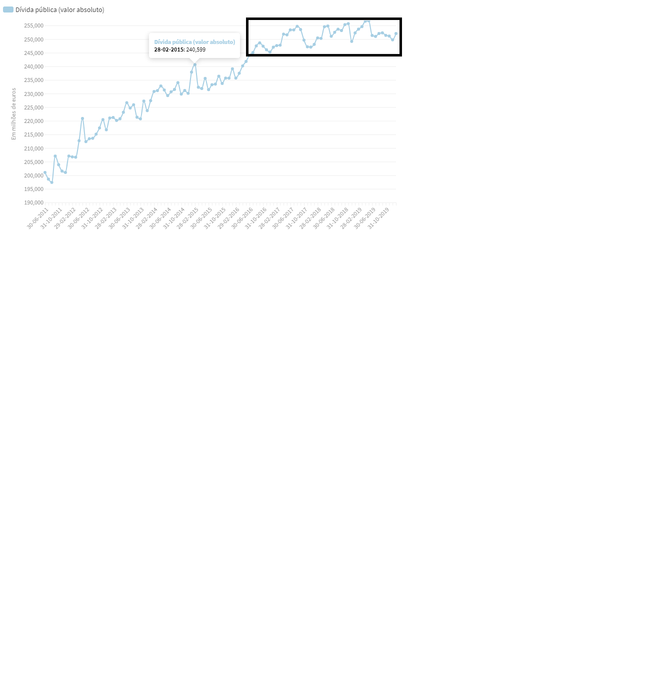 No final de 2019, a dívida pública situou-se em 249,7 mil milhões de euros (Gráfico 1), aumentando 0,6 mil milhões de euros em relação a 2018.