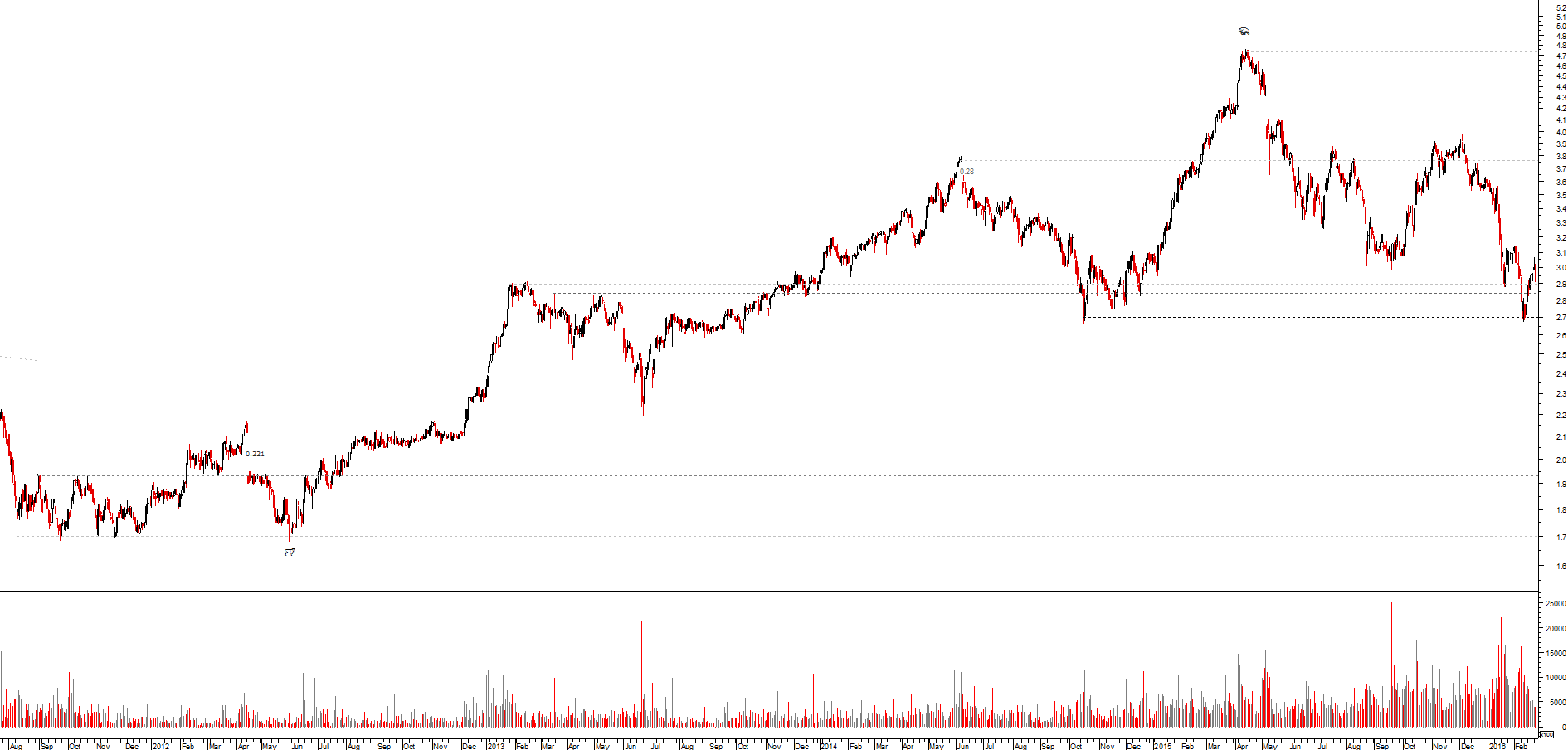 Este ponto toma especial relevo quando no gráfico diário é a marca que significaria a activação de um padrão de inversão. Na minha opinião, não é nem provável nem salutar que essa quebra aconteça já. Será importante que assistamos a uma nova consolidação antes de regressarmos às subidas, de preferência abaixo da resistência. Assim, quando/se quebrar, que o faça de forma convincente e sem deixar espaço para dúvidas. Mais importante que isso: uma retracção significaria a criação de uma referência de negociação. Isso ajudaria o título a subir, por providenciar a todos os que estão fora um ponto de entrada seguro. Ainda assim, é importante que se recorde que a resistência ainda não quebrou. E basta olharmos para o exemplo de Fevereiro para percebermos que consequências uma entrada precoce pode ter para uma carteira de negociação.