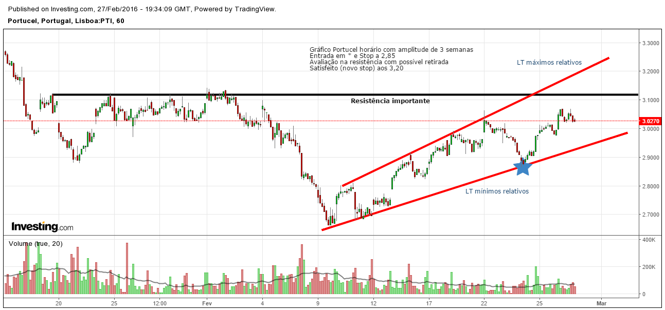 Quando analisei a Portucel, há cerca de um mês atrás, avisei para a necessidade de se ter em consideração a força da resistência no gráfico horário. Essa resistência foi mesmo decisiva, e empurrou o preço para mínimos. Foi, ainda assim, a quebra de outra resistência em alta que originou o actual rally ascendente. A quebra dos 2,8€ activou um duplo fundo no gráfico horário, e a partir daí o título tem vindo a suportar-se com um convincente padrão de higher-lows. O problema que se coloca é o mesmo que se colocava no mês passado: o confronto com a resistência dos 3,134€.
